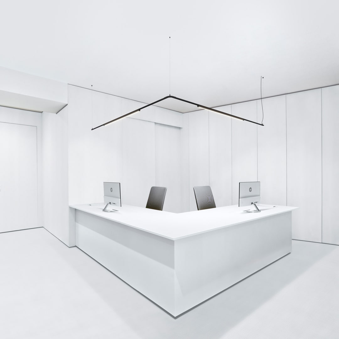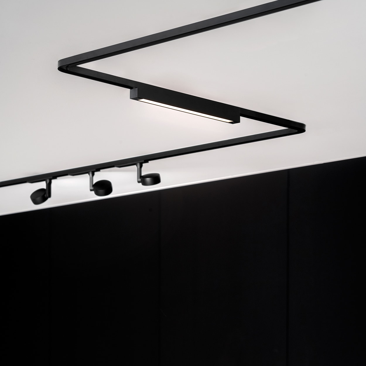 Profilé ultrafin en aluminium anodisé noir mat. Rail en saillie avec effet visuel trimless. Uniformité visuelle, ligne minimaliste noire. Miniaturisation optimale du rail, des luminaires et des composants.