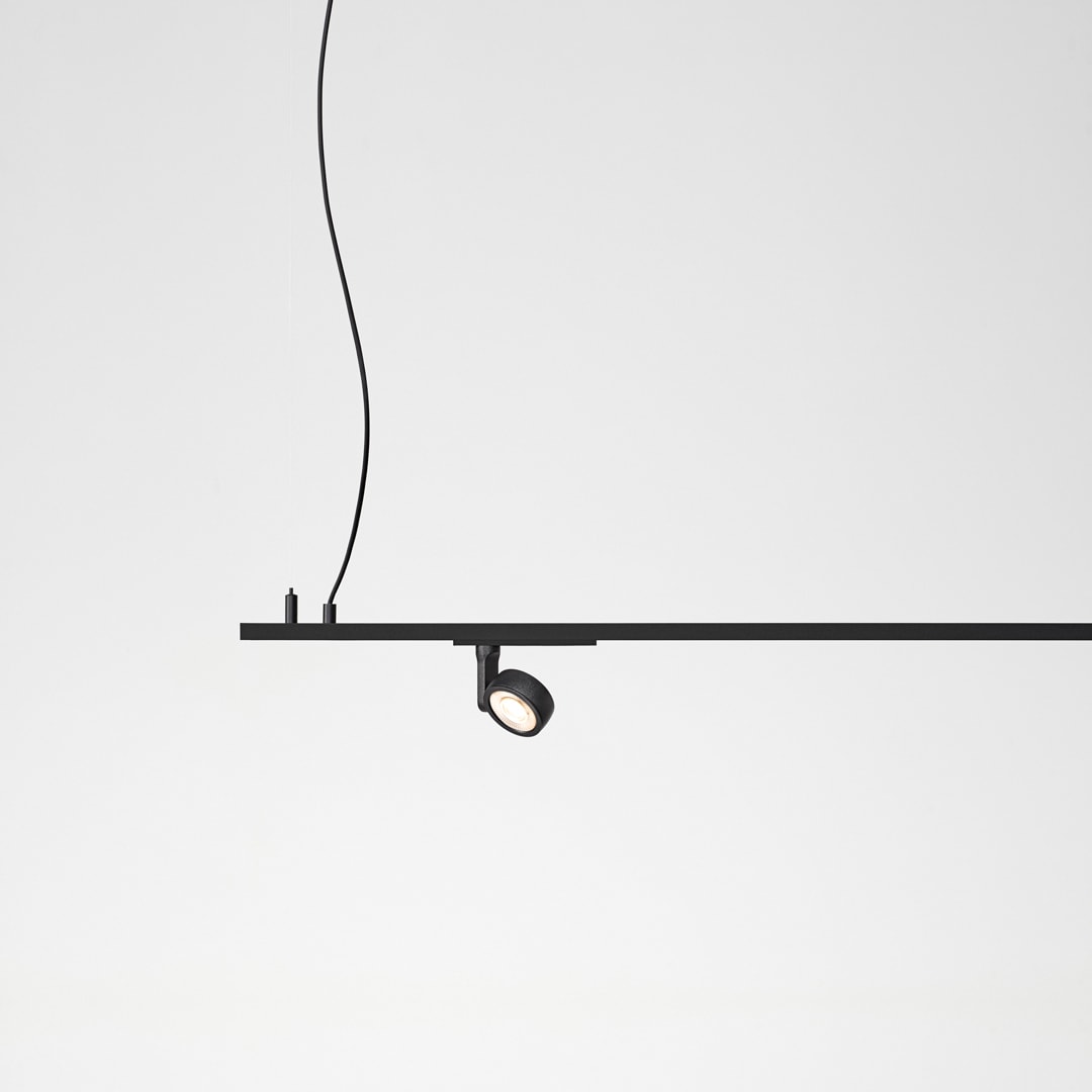 Profilé ultrafin en aluminium anodisé noir mat. Rail en saillie avec effet visuel trimless. Uniformité visuelle, ligne minimaliste noire. Miniaturisation optimale du rail, des luminaires et des composants.