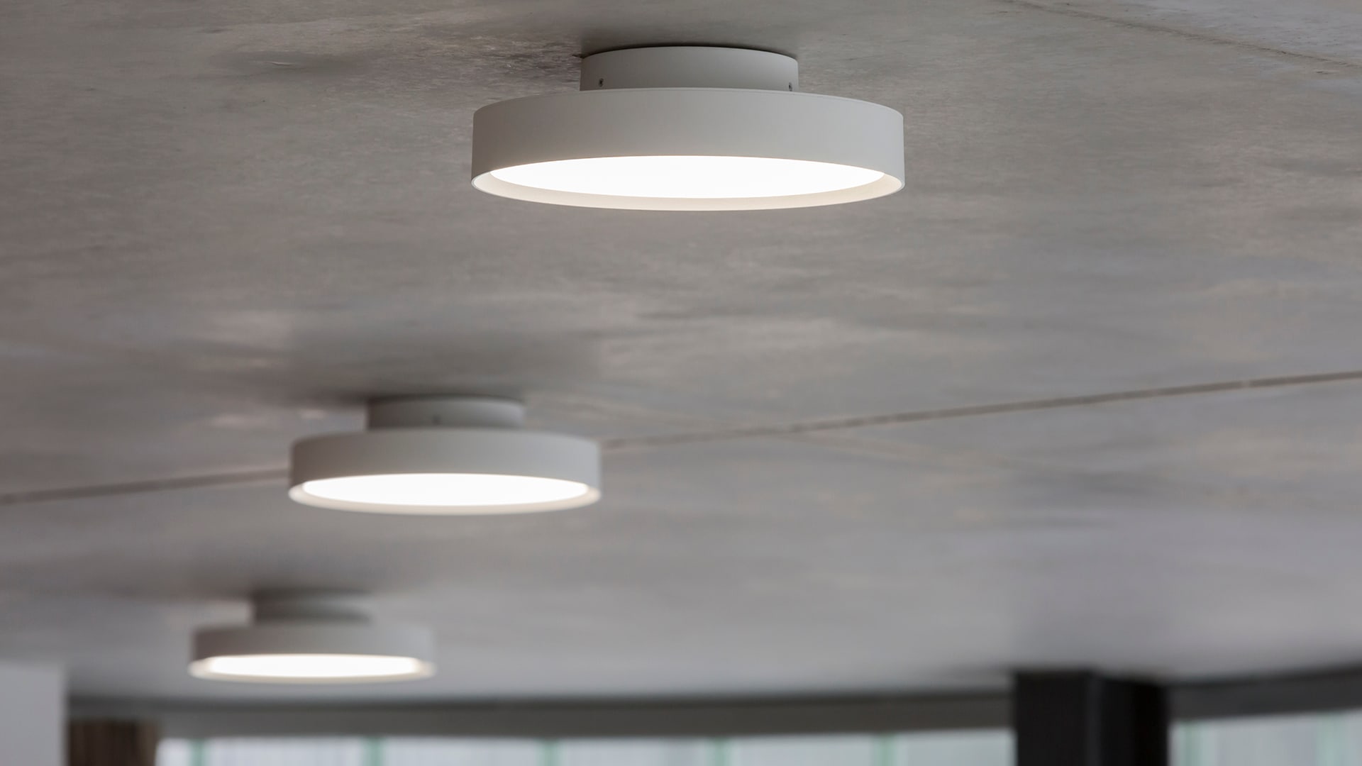 Grand attrait visuel. Il a un flux lumineux élevé, adapté pour être installé sur de hauts plafonds. Installé, il semble être en lévitation à 5 cm du plafond. Plusieurs puissances possibles. Downlight de surface avec driver intégré.