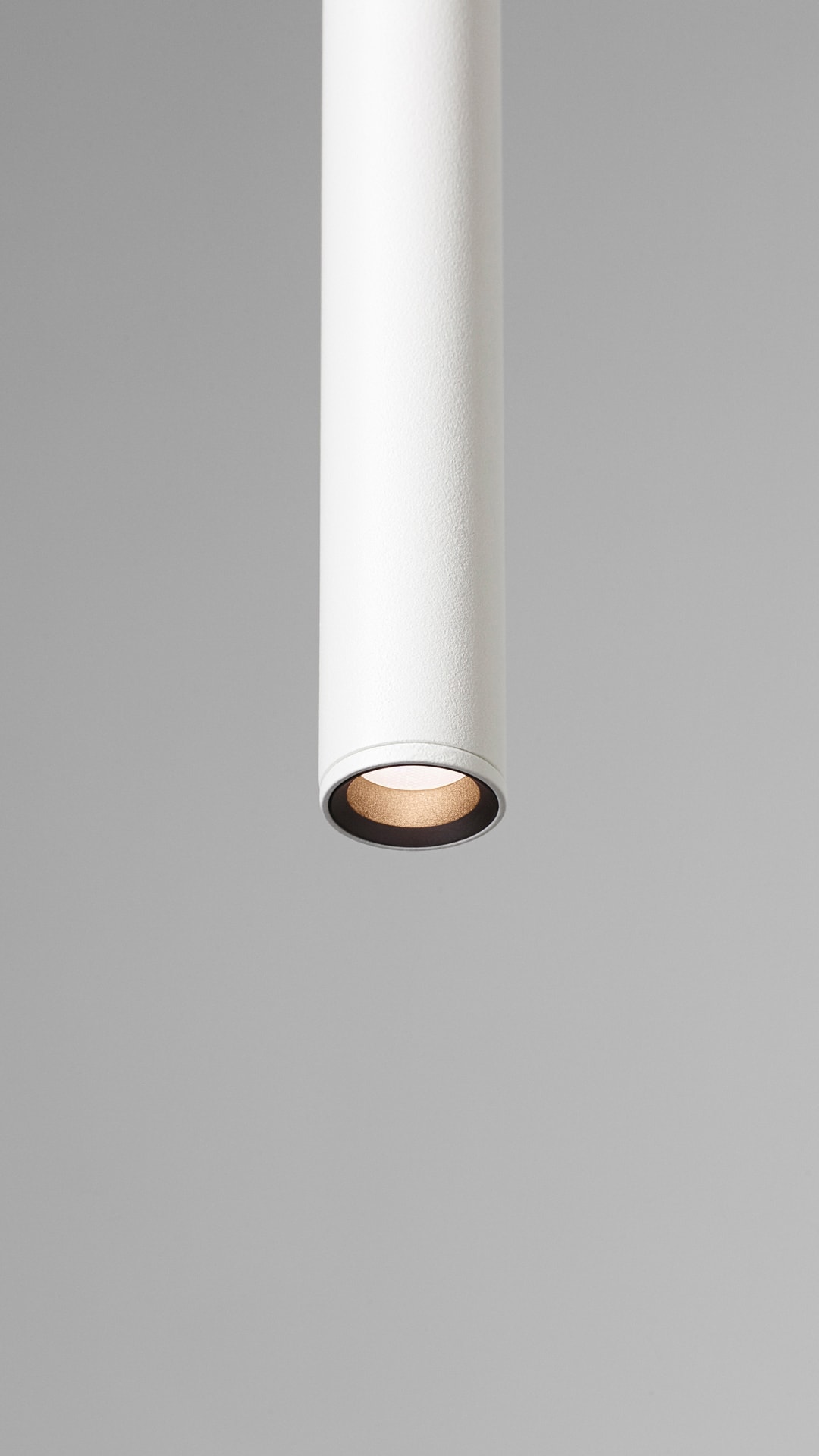 Confort visuel. Disponible en 3 longueurs. Forme cylindrique et extrêmement fine. Présence discrète dans l’espace, structure de 27 mm. Éclairage ciblé. Verticalité et pureté minimaliste.