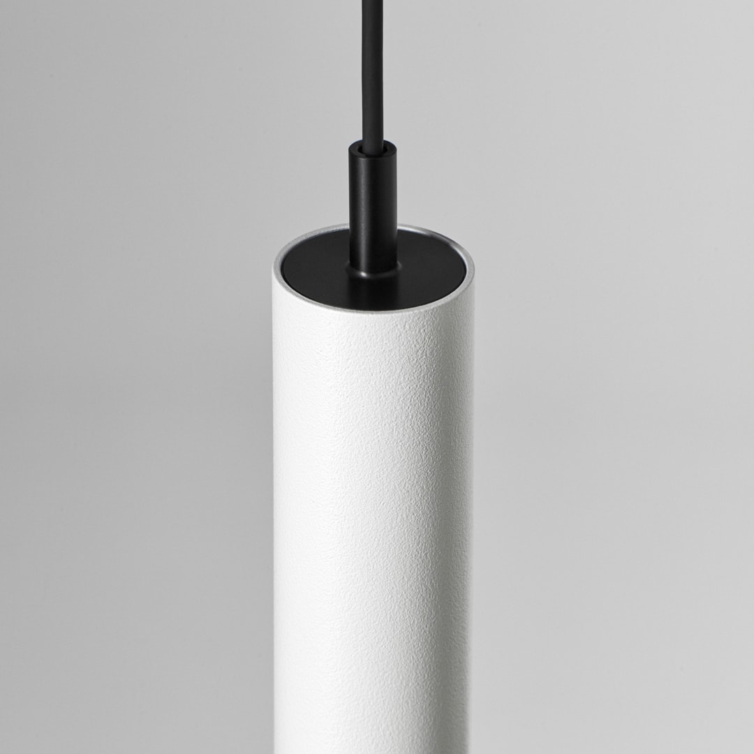 Confort visuel. Disponible en 3 longueurs. Forme cylindrique et extrêmement fine. Présence discrète dans l’espace, structure de 27 mm. Éclairage ciblé. Verticalité et pureté minimaliste.
