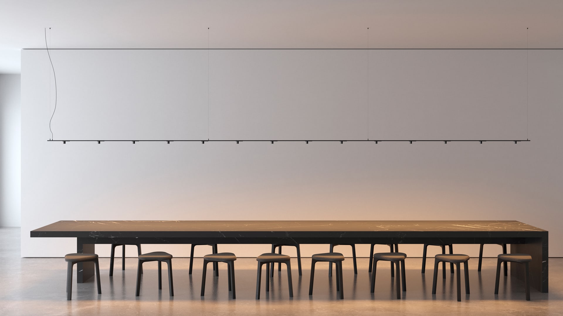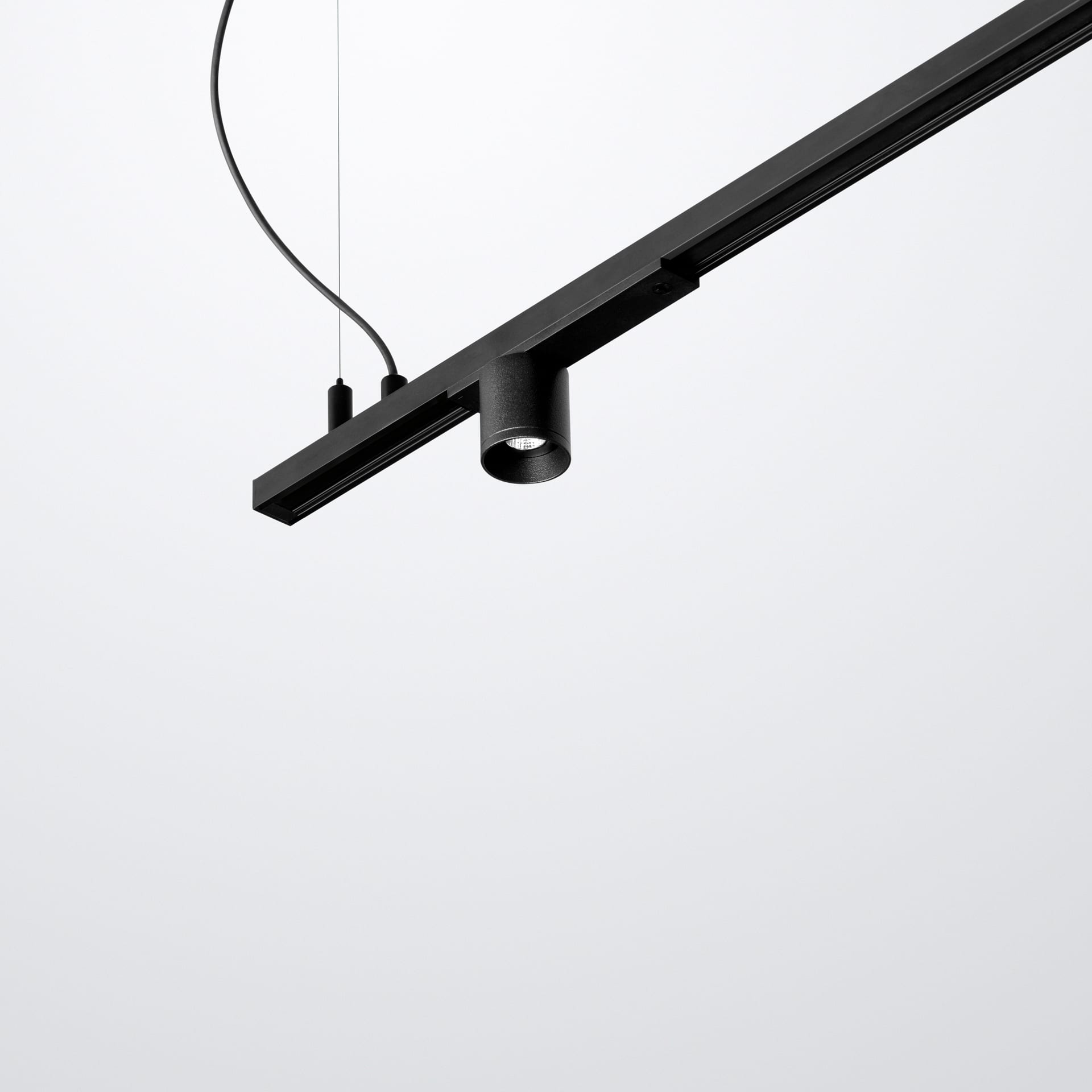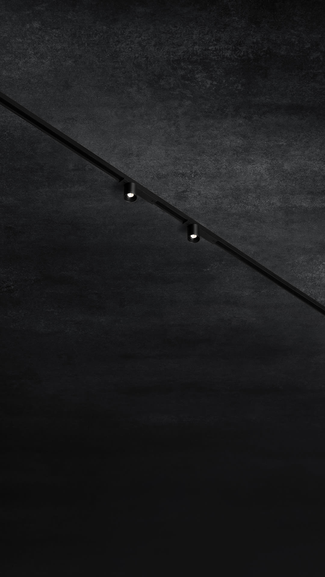 Profilé ultrafin en aluminium anodisé noir mat. Rail en saillie avec effet visuel trimless. Uniformité visuelle, ligne minimaliste noire. Miniaturisation optimale du rail, des luminaires et des composants.