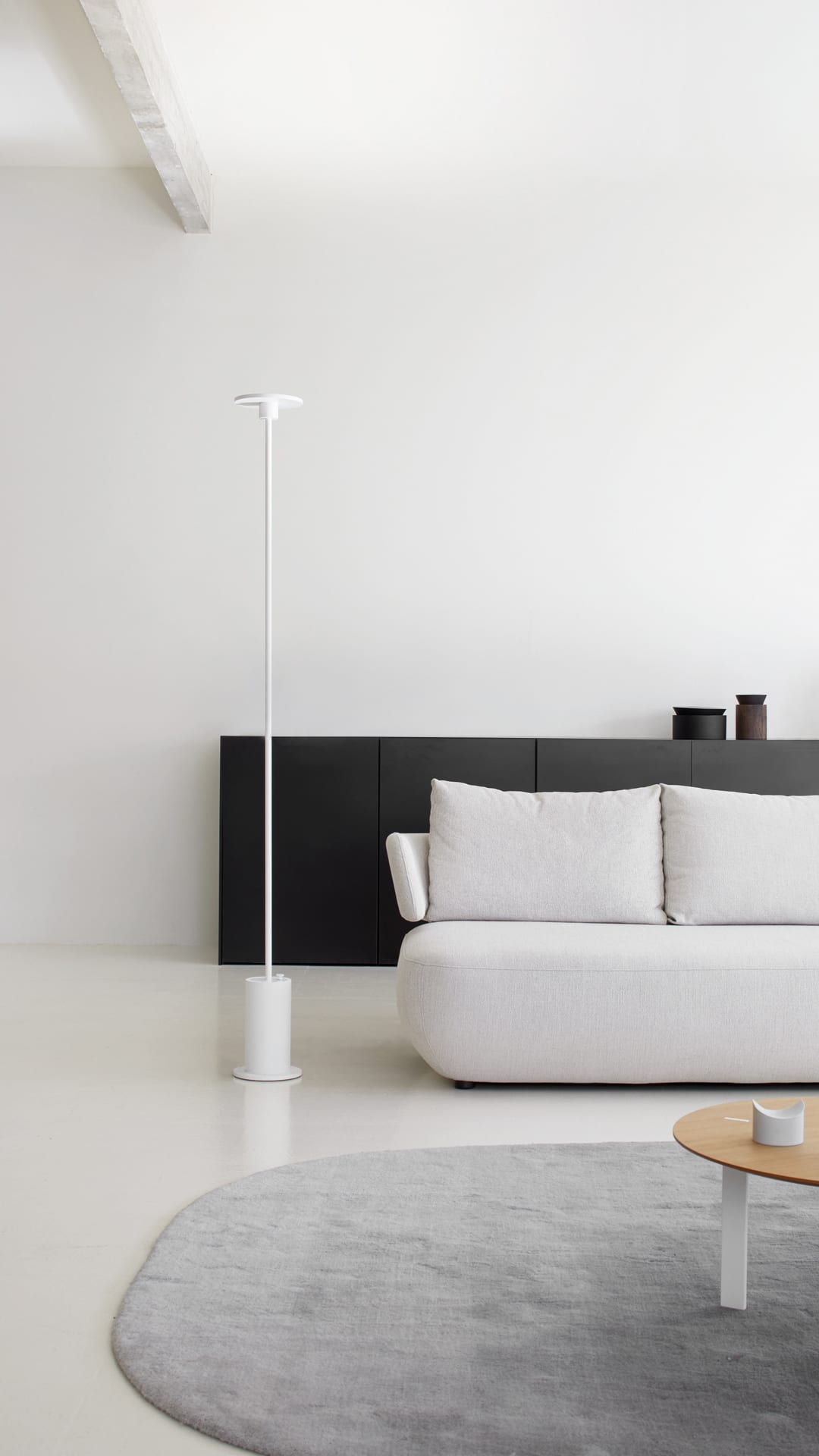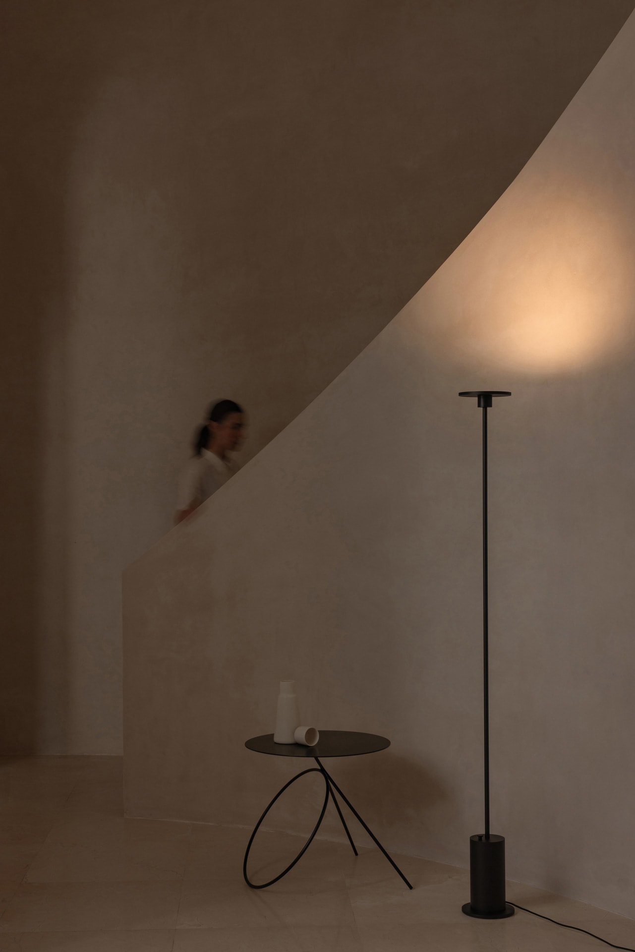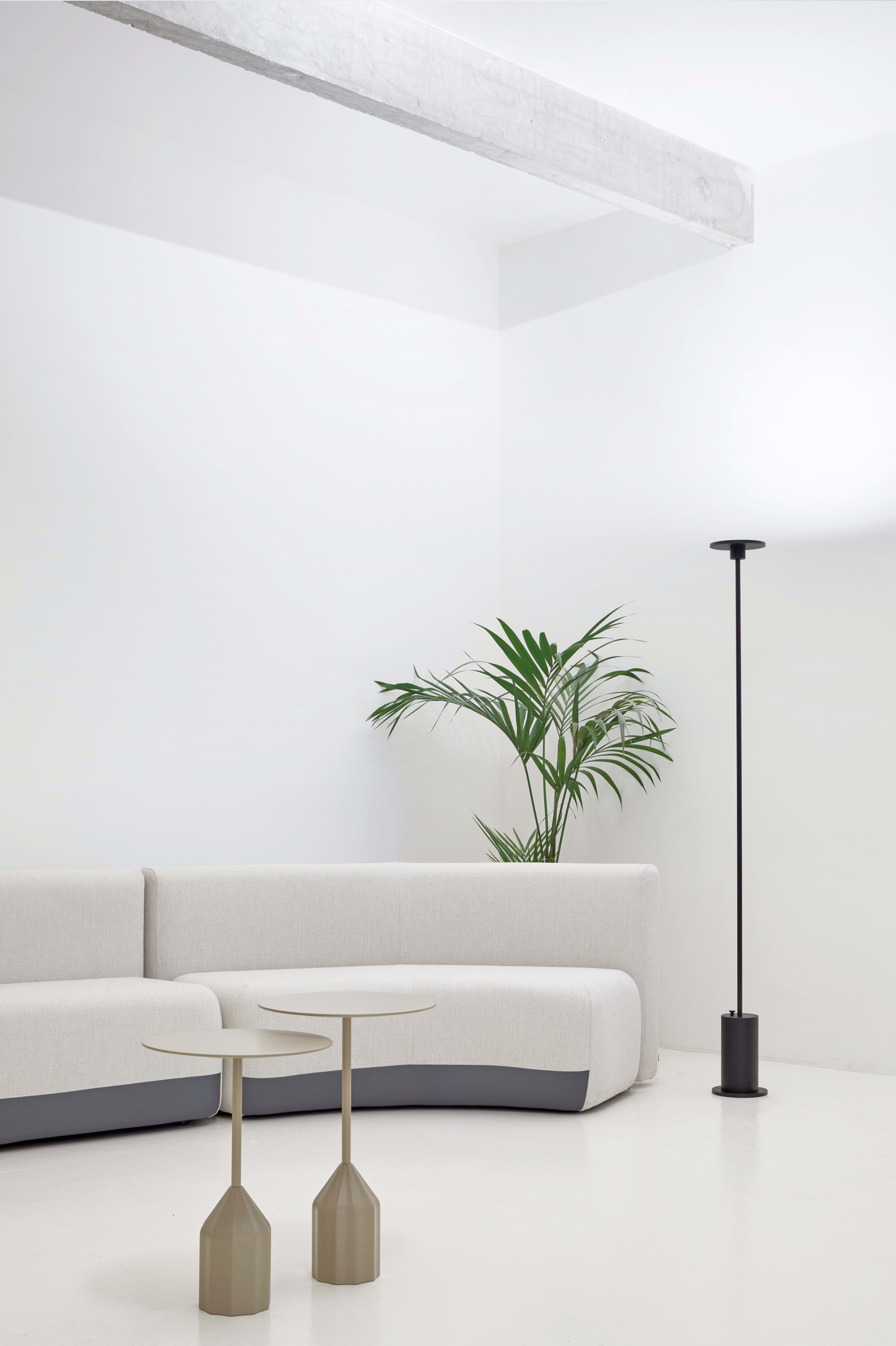 Bain de lumière sur mur et plafond. Lumière indirecte, grand confort visuel. Il cache complètement la source de la lumière. Lampadaire à la verticalité et au minimalisme marqués.
