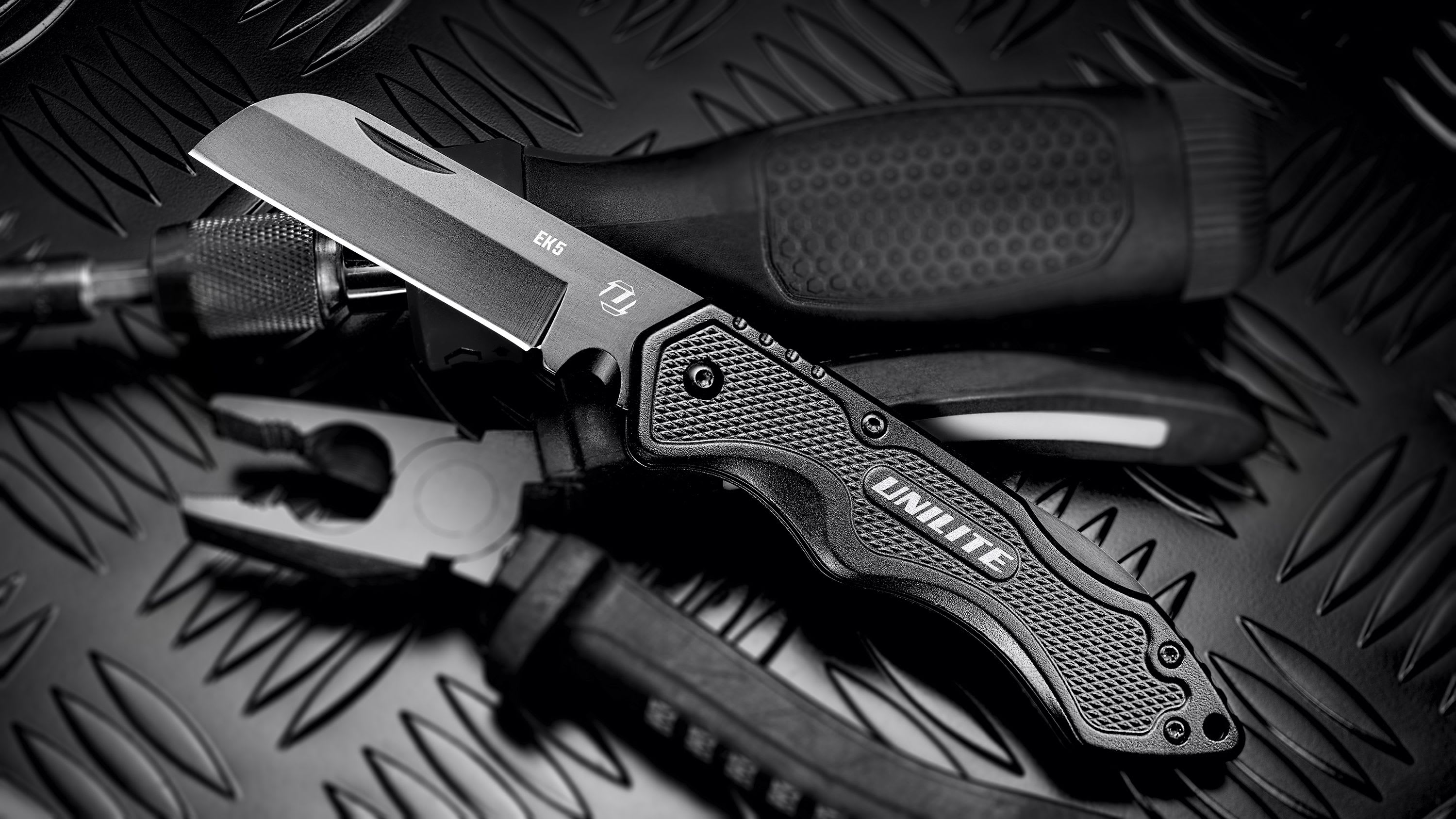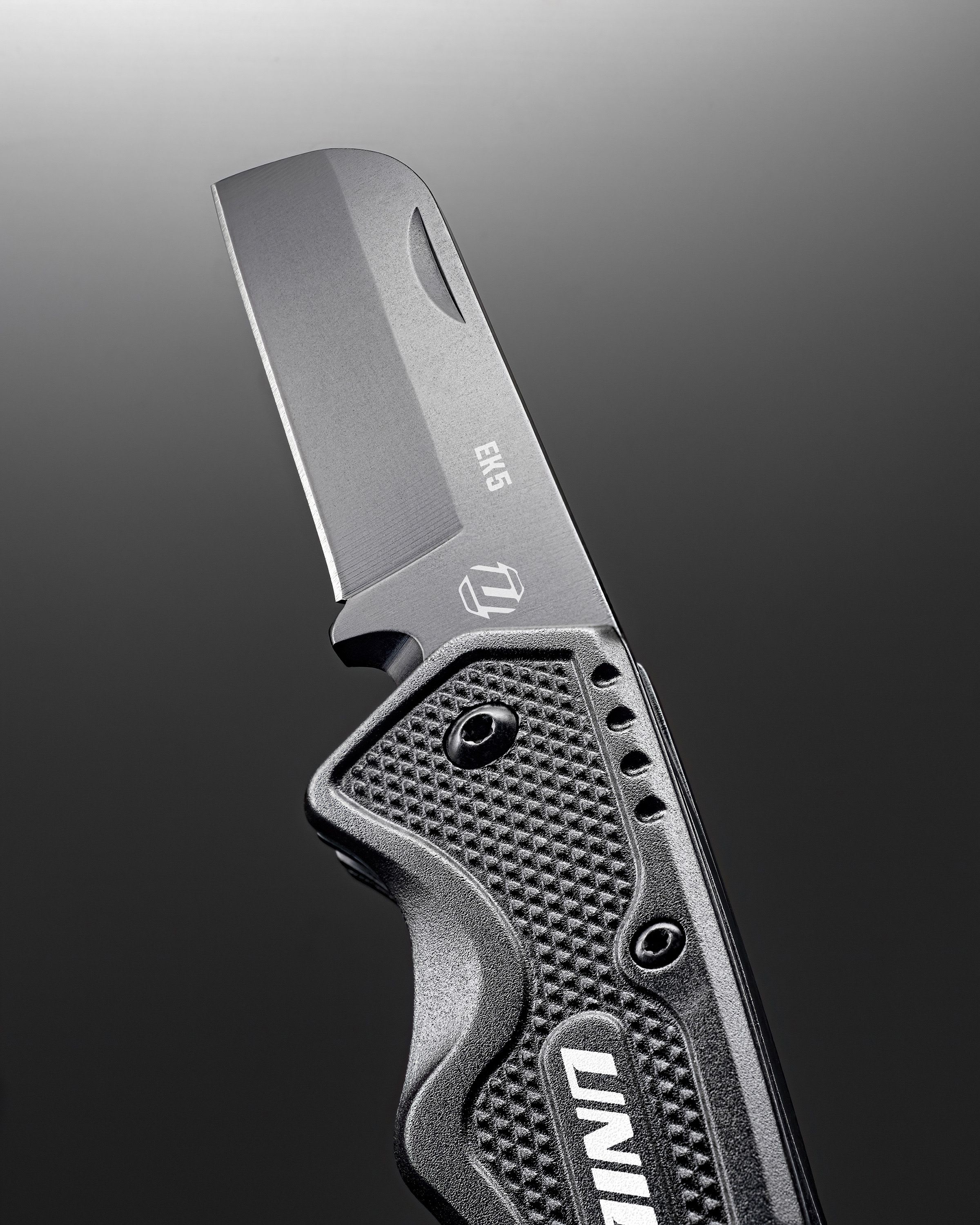 Lame "pied de mouton " en acier inoxydable en carbone. Dureté de la lame 56-58 HCR. Encoche intégrée pour dénuder les câbles. Poignée ergonomique en aluminium ultra résistante. Sytème de verrouillage à pompe arrière "back-lock".