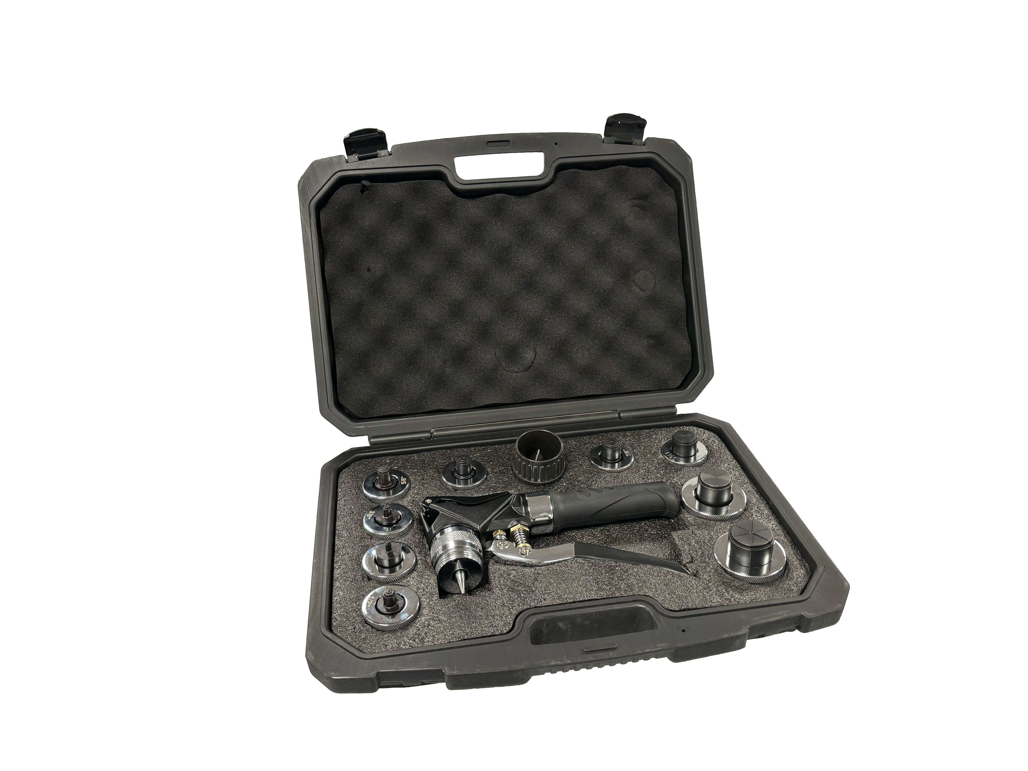 Kit à emboîture avec pince hydraulique, outil d'ébavurage, 9 têtes (1/4”, 3/8”, 1/2”, 5/8”, 3/4”, 7/8”, 1 & 1/8”, 1 & 3/8” & 1 & 5/8”), têtes de rechange disponibles, utilisation à une seul main, têtes gravées au laser, conception compacte.