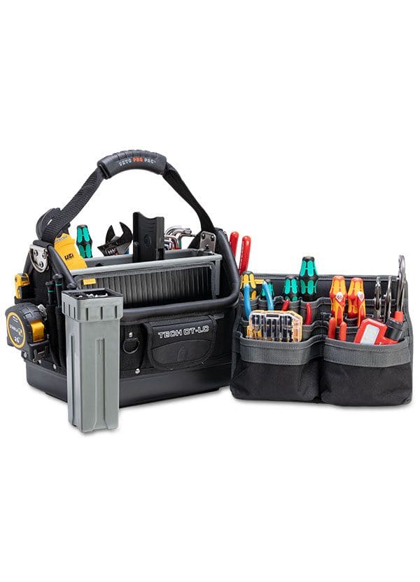 Sac à outils fourre-tout grande capacité avec panneaux amovibles et échangeables livré avec un panneau de 10 poches, un panneau de 15 poches et un panneau de stockage en vrac. Dimensions H305xL405XP305mm, poids 4kgs, volume utile 15,5L
