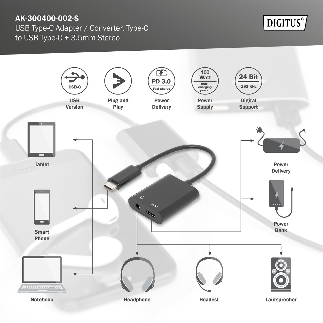 Assmann Electronic - Adaptateur USB C M -3.5mm F C F 0.15m USB 3.1 Gen2 5A 10GB noir - AK-300400-002-S