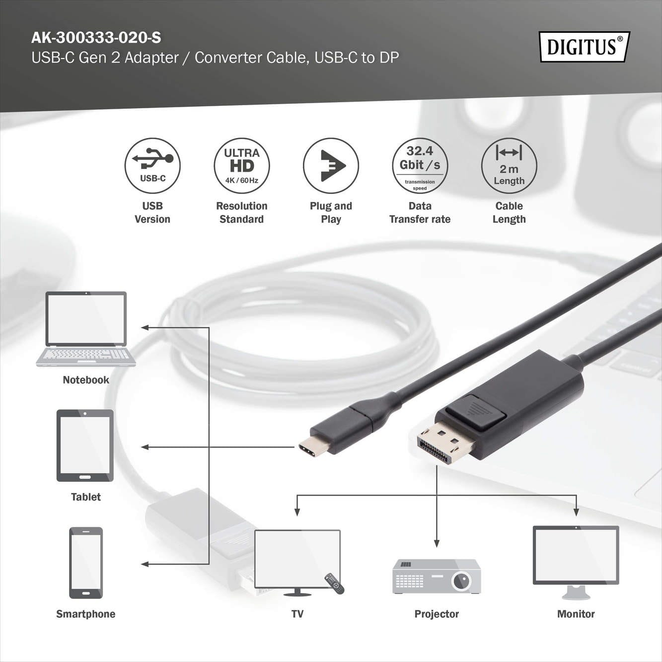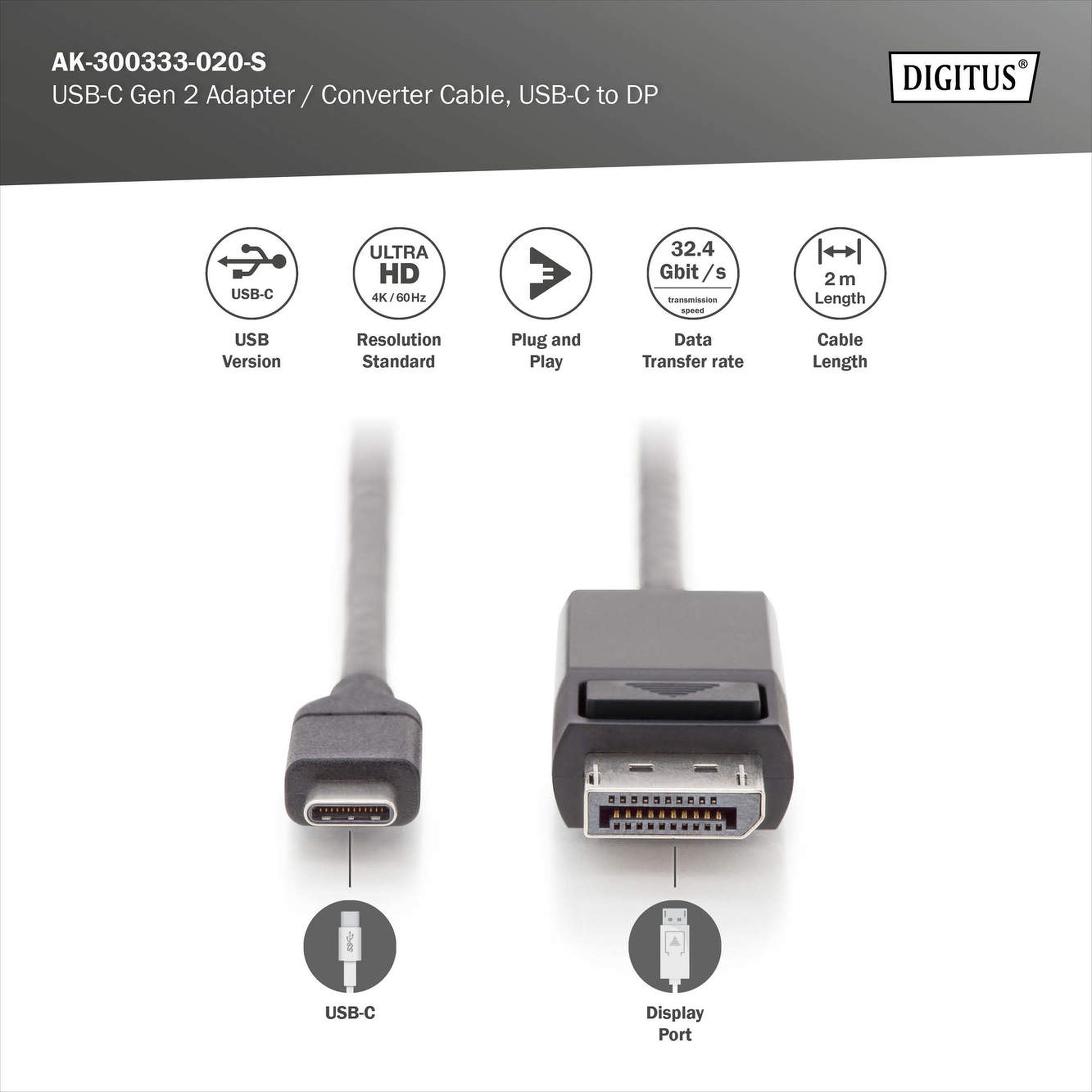 Assmann Electronic - Adaptateur USB C M - DP M 2m 4K/60Hz 32,4 GB CE noir doré - AK-300333-020-S