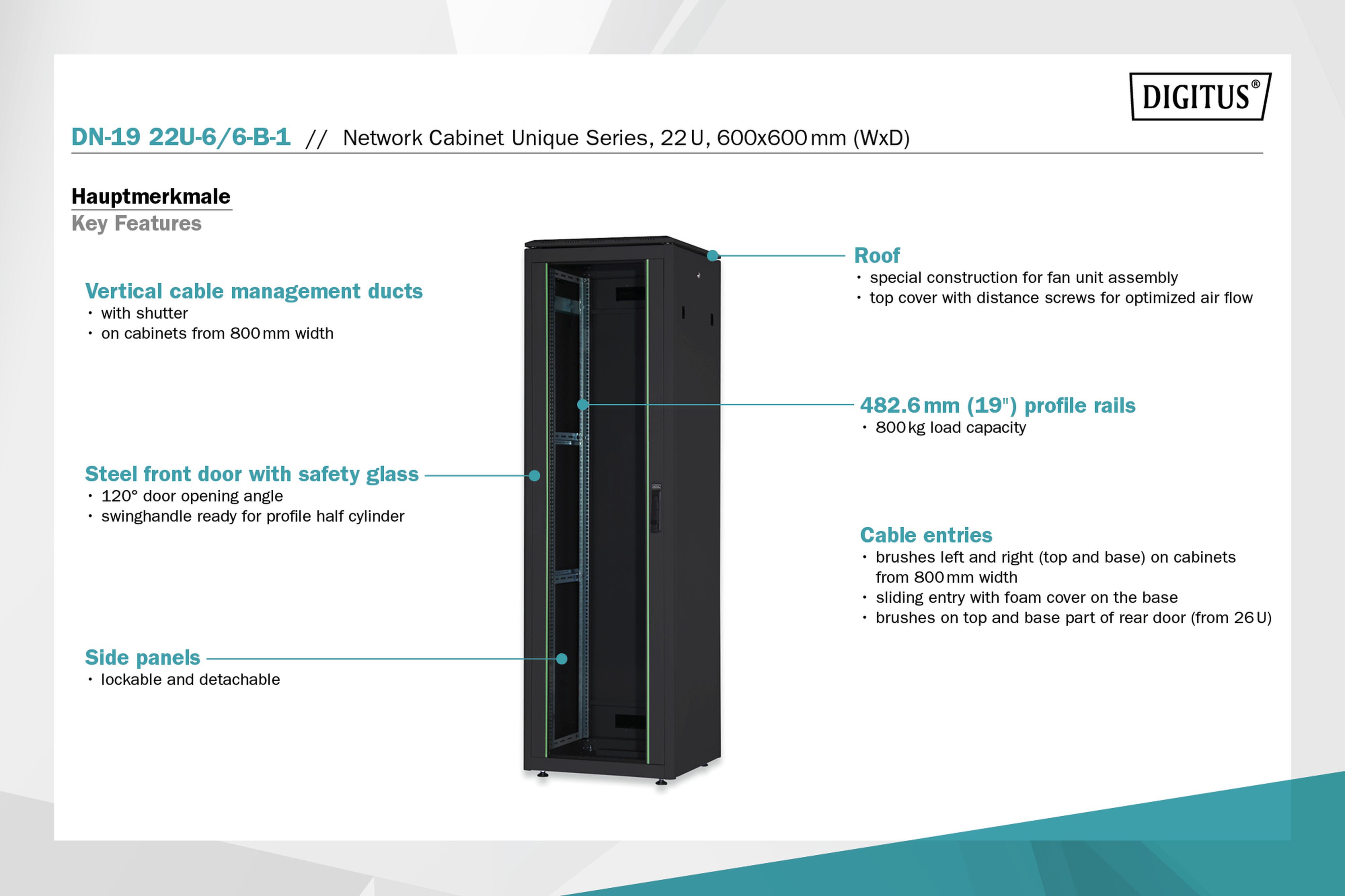 Assmann Electronic - Baie réseau 22U, Unique 1164x600x600 mm, couleur noir (RAL 9005) - DN-19 22U-6/6-B-1