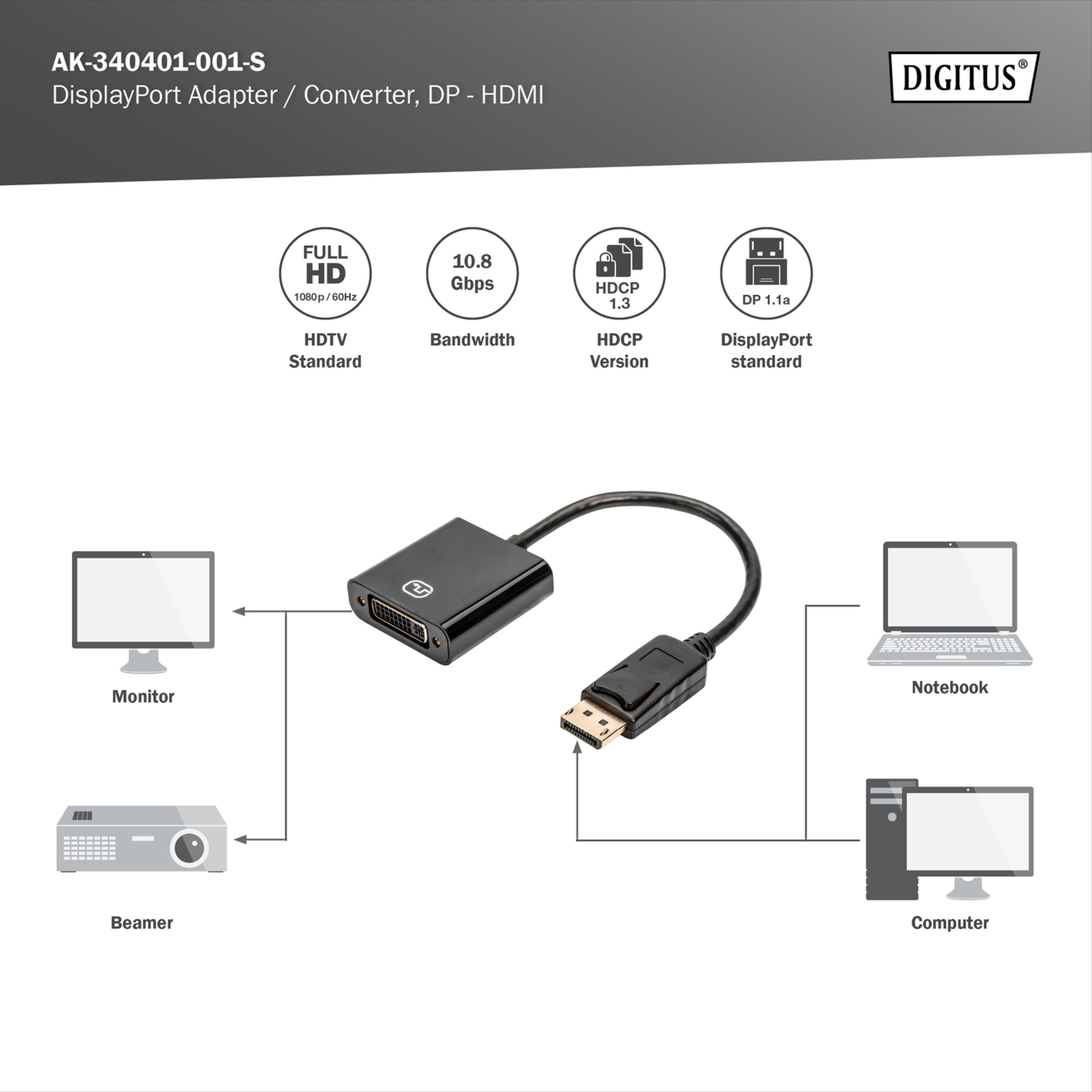 Assmann Electronic - Câble adaptateur DP-DVI (24+5) M/F 0,15m DP1.1 noir - AK-340401-001-S