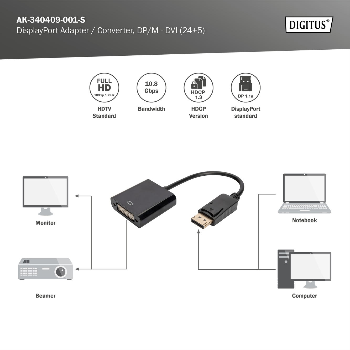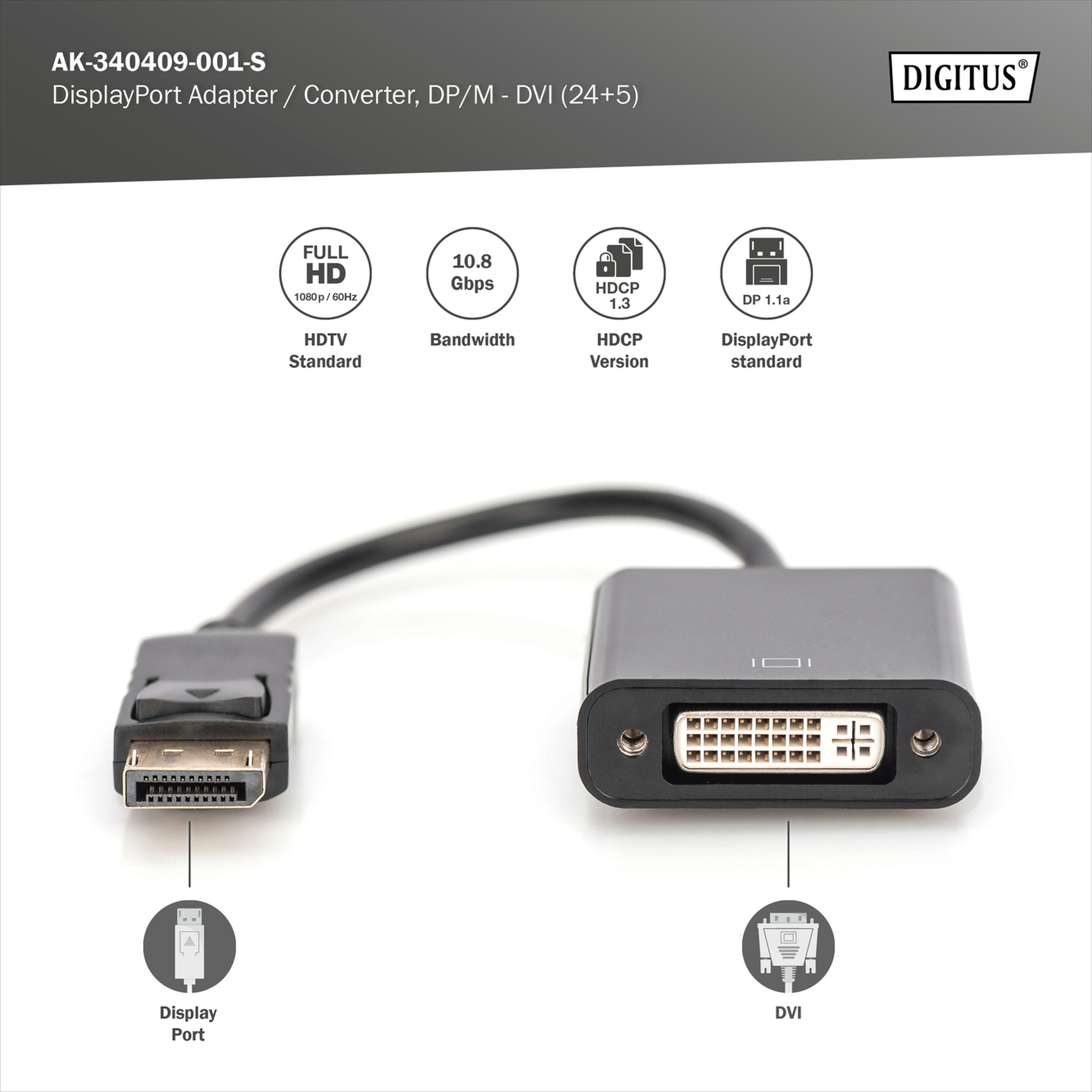 Assmann Electronic - Câble adaptateur DP - DVI (24+5) M/F, 0,15m verrouillage DP 1.1a CE noir - AK-340409-001-S