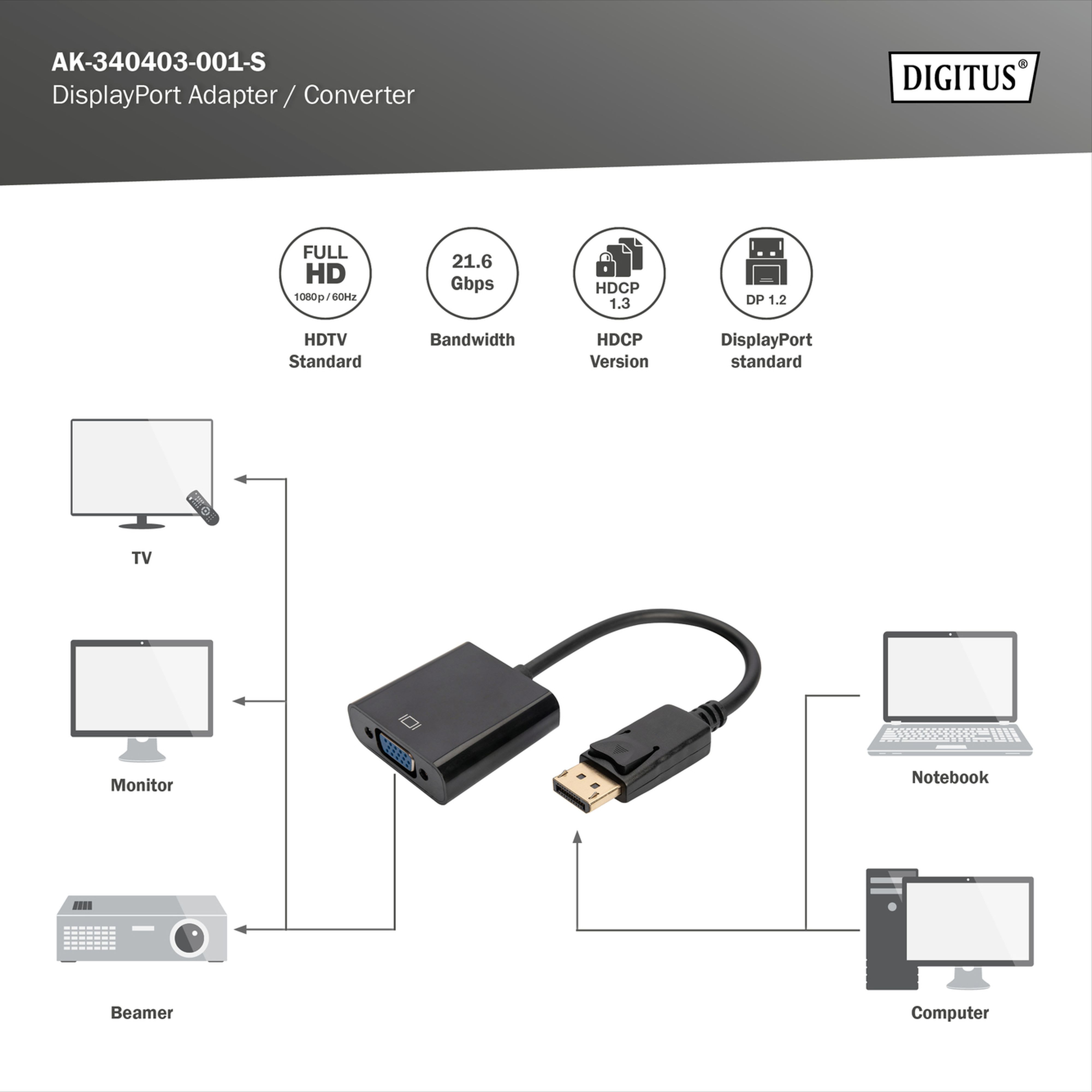 Assmann Electronic - Câble adaptateur DP - HD15 MF 0,15m verrouillage DP 1.2 CE noir - AK-340403-001-S