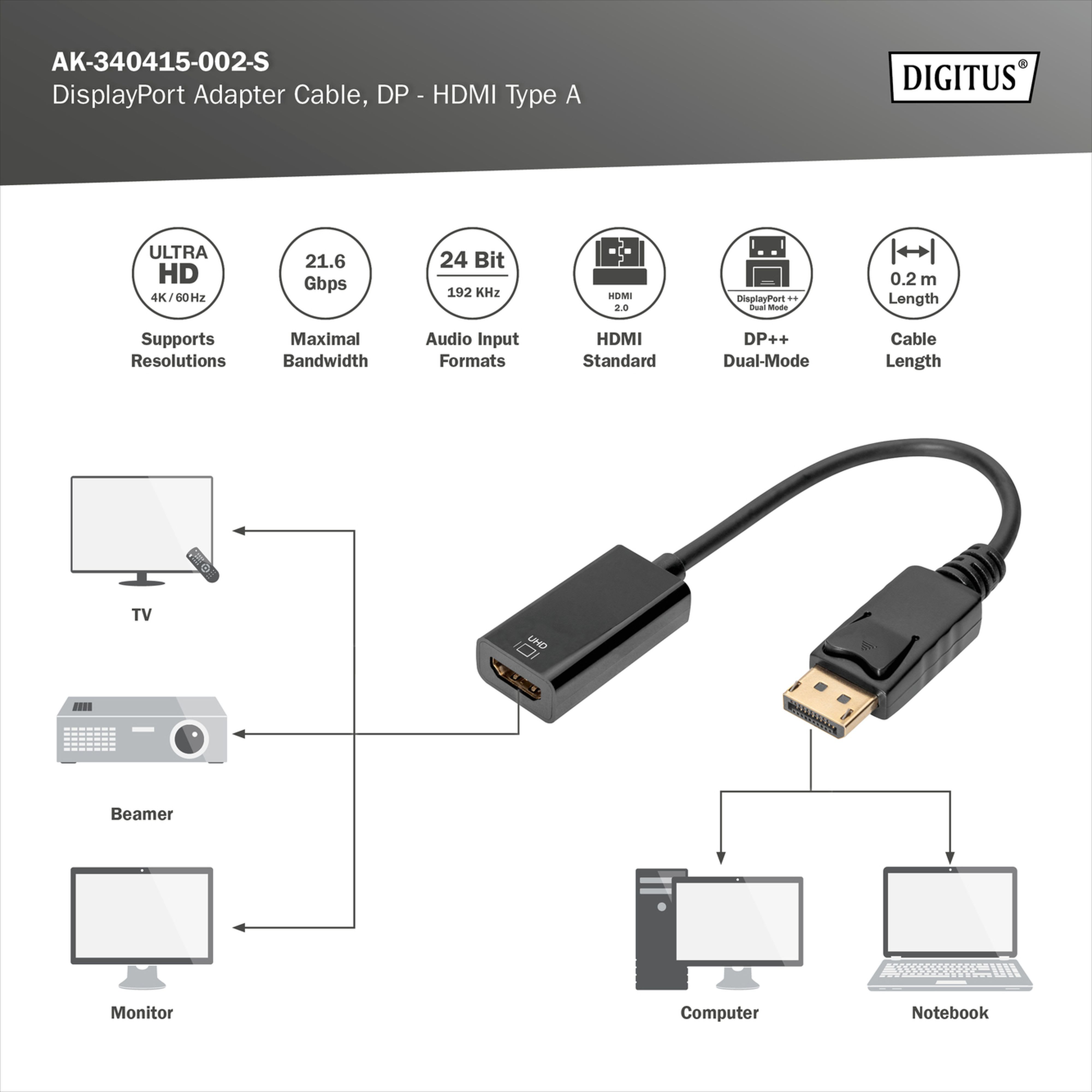 Assmann Electronic - Câble adaptateur DP - HDMI A M/F 0.2m verrouillage HDMI 2.0 actif CE doré noir - AK-340415-002-S