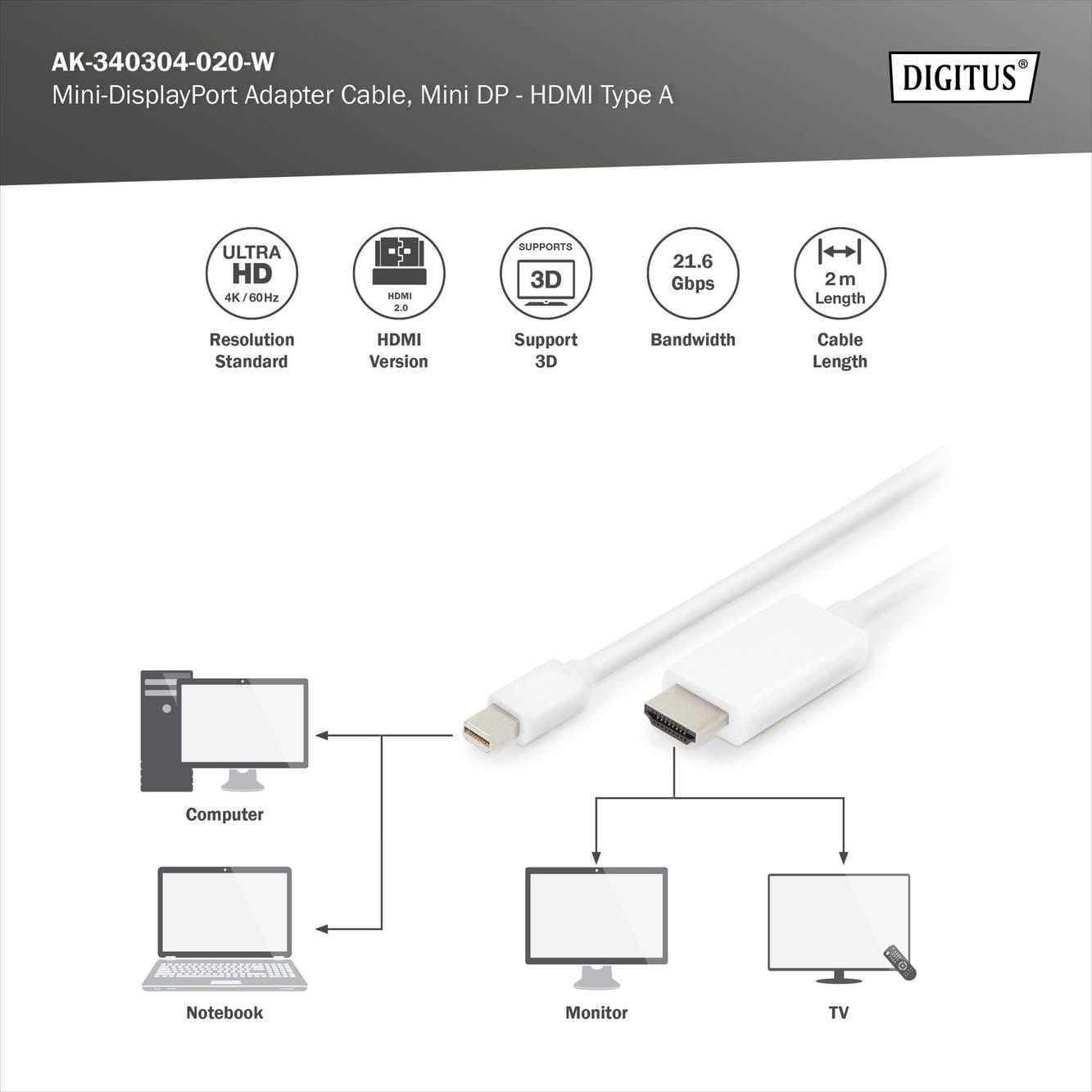 Assmann Electronic - Câble adaptateur mini DP - HDMI A M/M 2m DP 1.2 HDMI 2 4K/60Hz, CE blanc - AK-340304-020-W