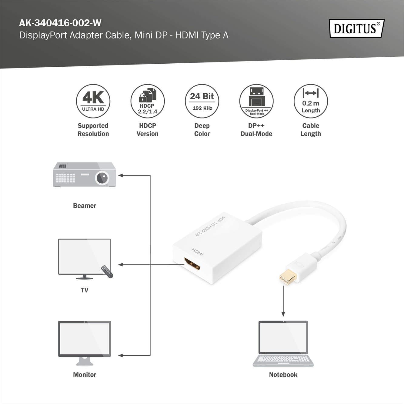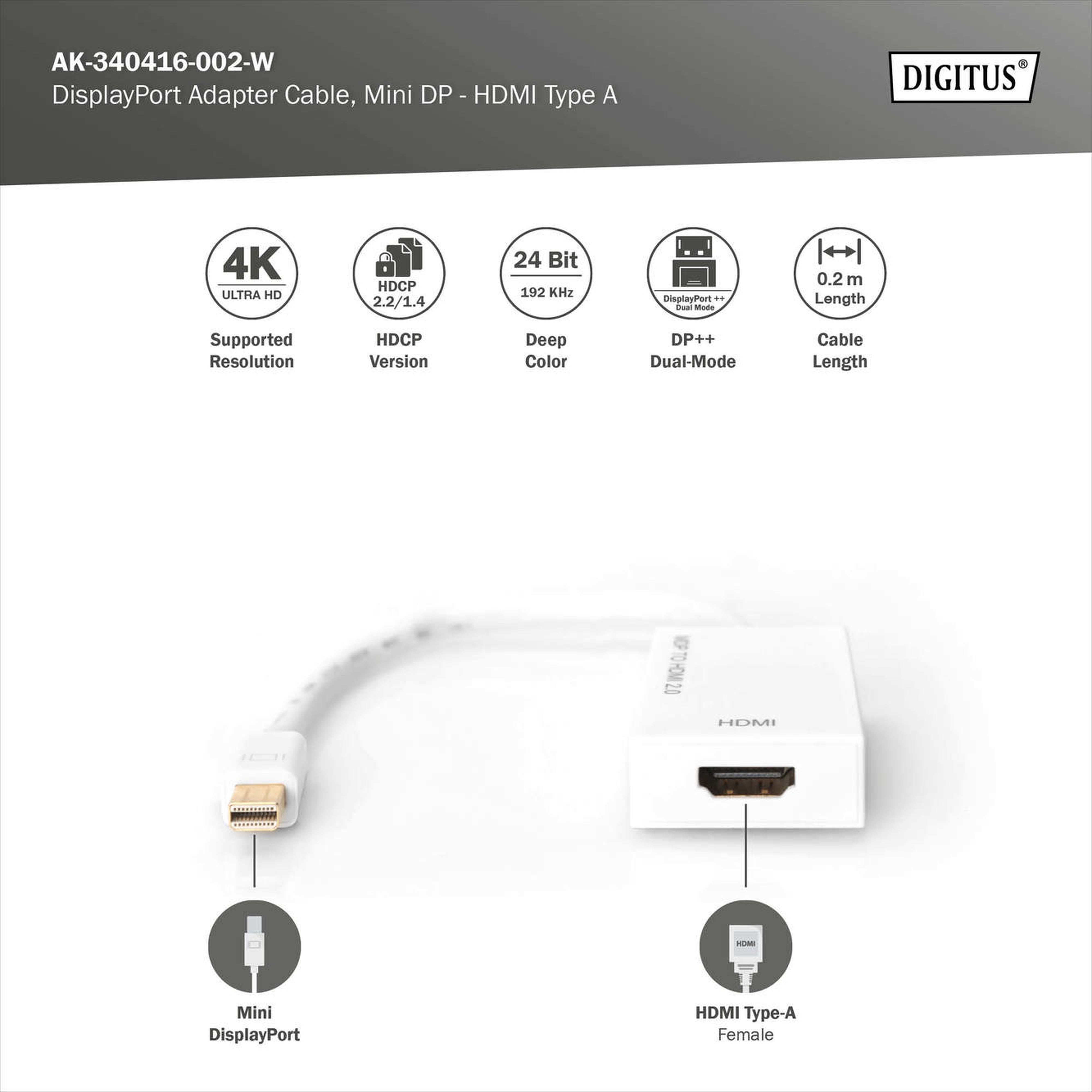 Assmann Electronic - Câble adaptateur mini DP - HDMI A MF 0,2m HDMI 2 actif CE blanc - AK-340416-002-W