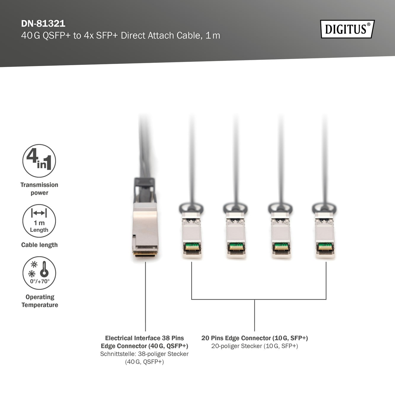 Assmann Electronic - Câble breakout DAC, 1 m, 1 x 40G vers 4 x 10G 1 x 40G vers 4 x 10G - DN-81321
