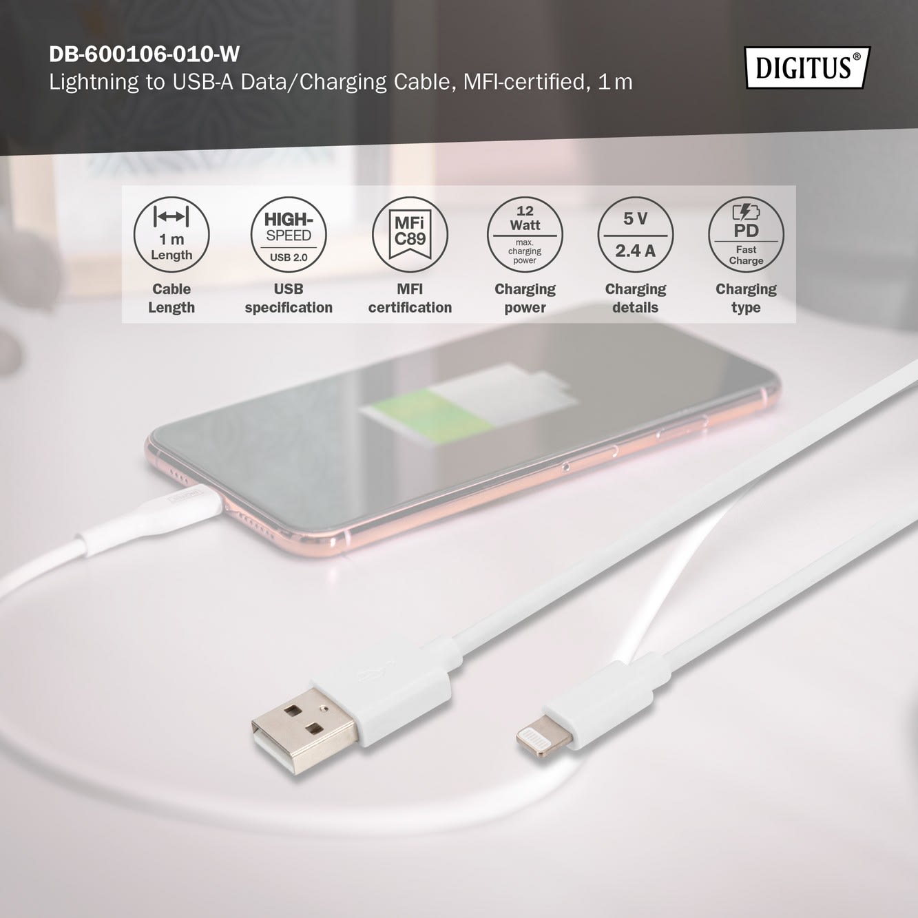 Assmann Electronic - Câble chargement, Lightning ? USB A M/M, 1,0 m, iP5/6/7, haut débit, MFI, blanc - DB-600106-010-W