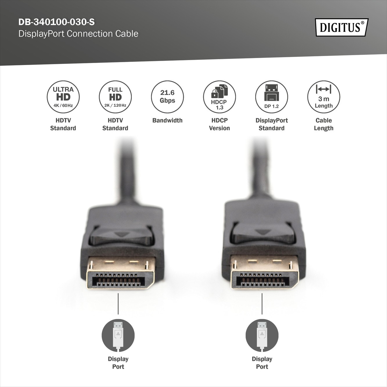 Assmann Electronic - Câble connexion DisplayPort, DP MM, 3m, verrouillage, DP 1.2, Ultra HD 4K, noir - DB-340100-030-S