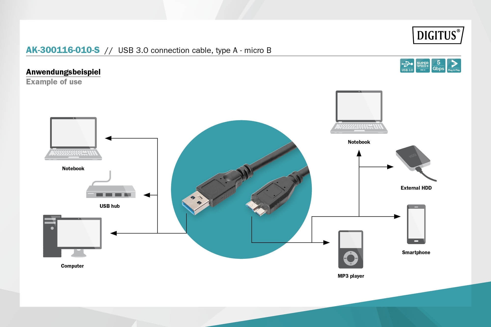 Assmann Electronic - Câble de connexion USB 3.0, type A - micro B MM, 1.0m, conforme USB 3.0, noir - AK-300116-010-S