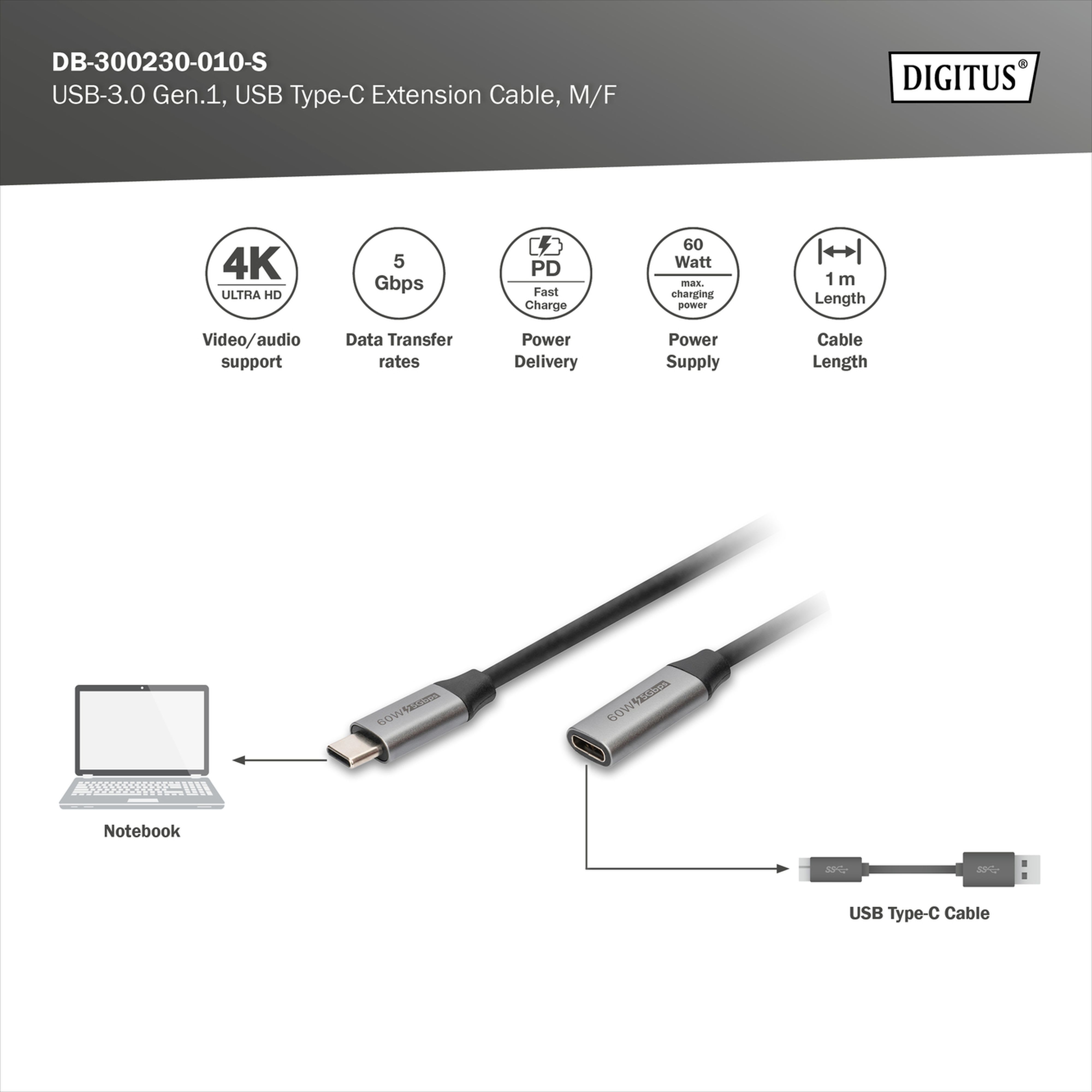 Assmann Electronic - Câble d'extension USB 3.0 Gen1, USB-C/M vers USB-C/F PD, 60W, 1m, 4K/60 Hz noir - DB-300230-010-S