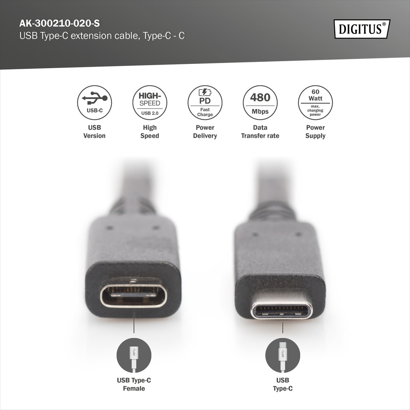 Assmann Electronic - Câble d'extension USB C-C M/F 2,0m 3A 480MB V2.0 noir - AK-300210-020-S