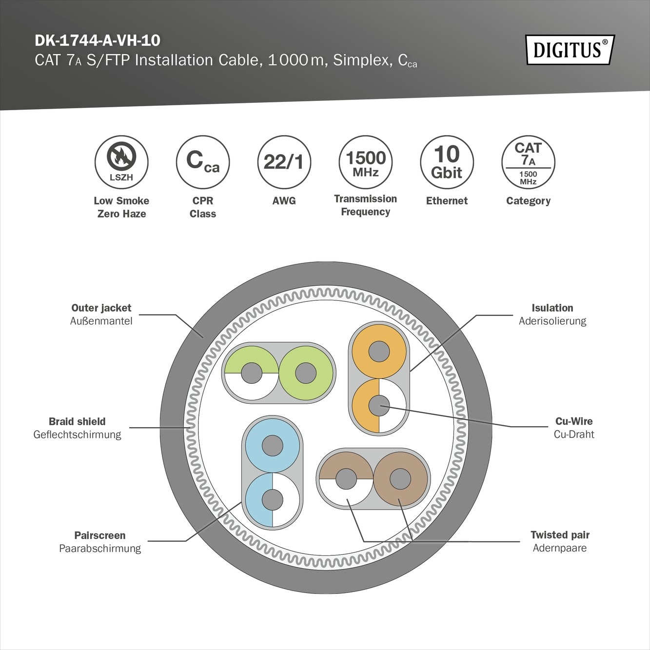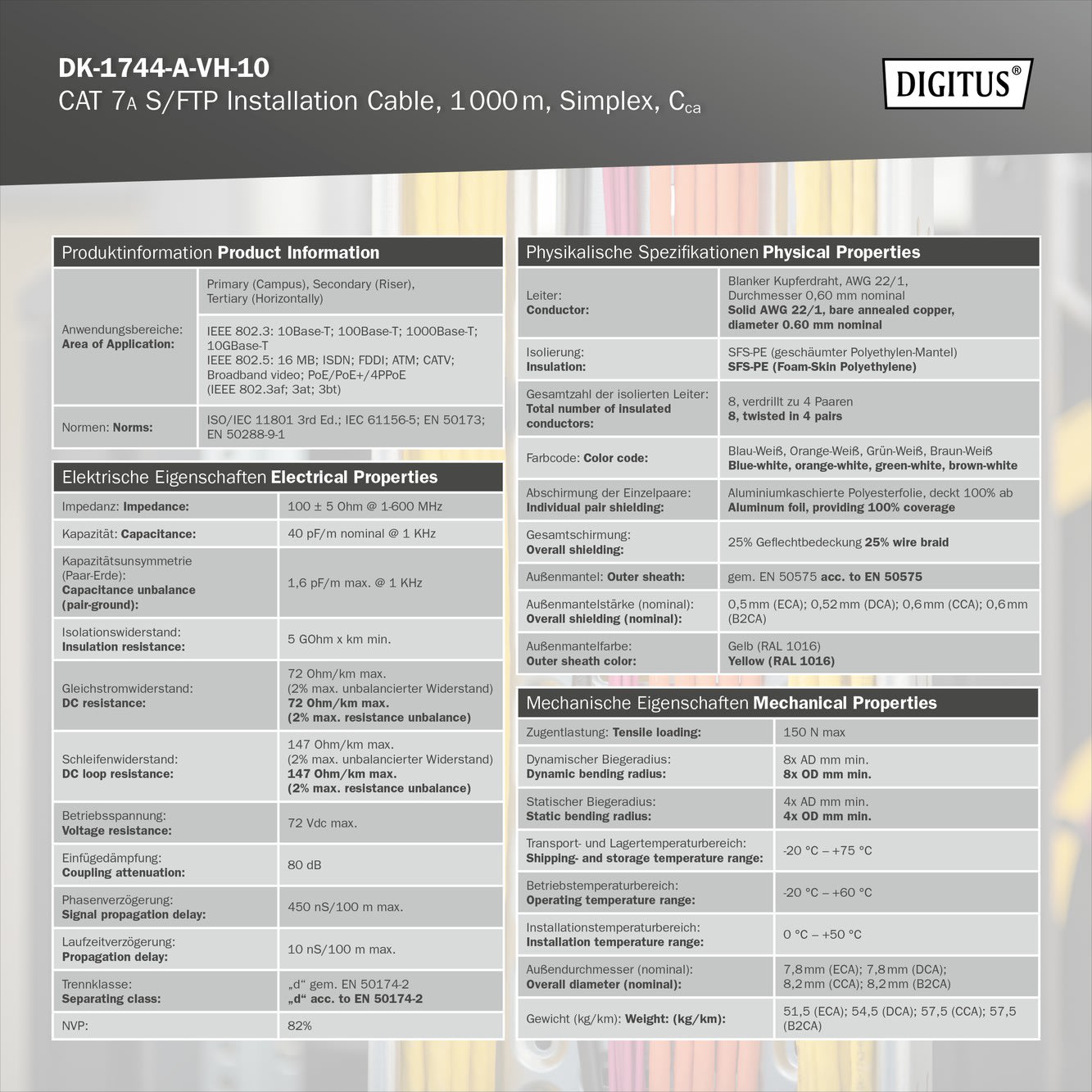 Assmann Electronic - Câble d'instal. CAT 7A S-FTP, 1500 MHz Cca, AWG 22/1, bobine 1000 m, SX, jaune - DK-1744-A-VH-10