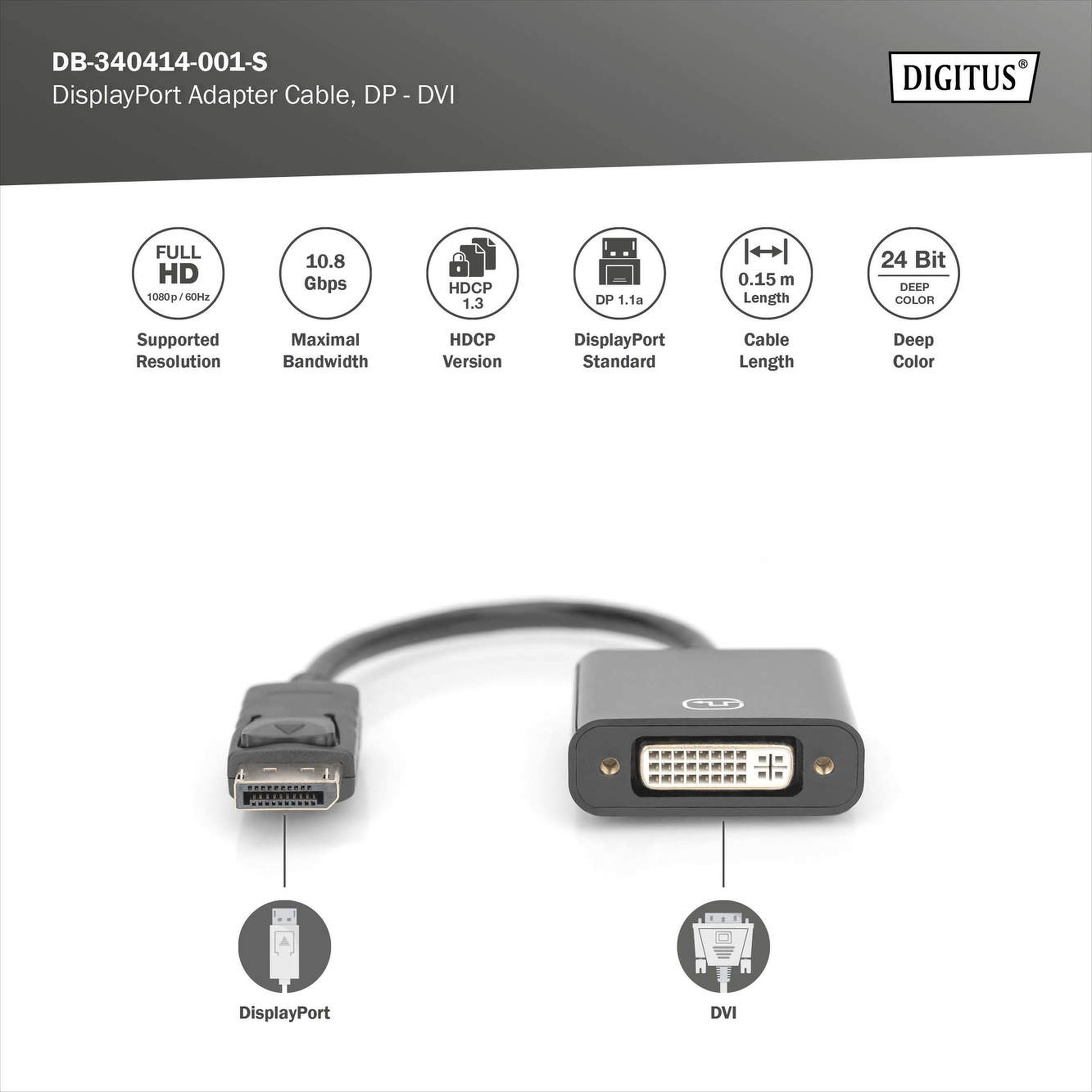 Assmann Electronic - Câble DisplayPort, DP ? DVI 24+5 M/F, 0,15m, verrouillage, compat. DP 1.1, noir - DB-340414-001-S