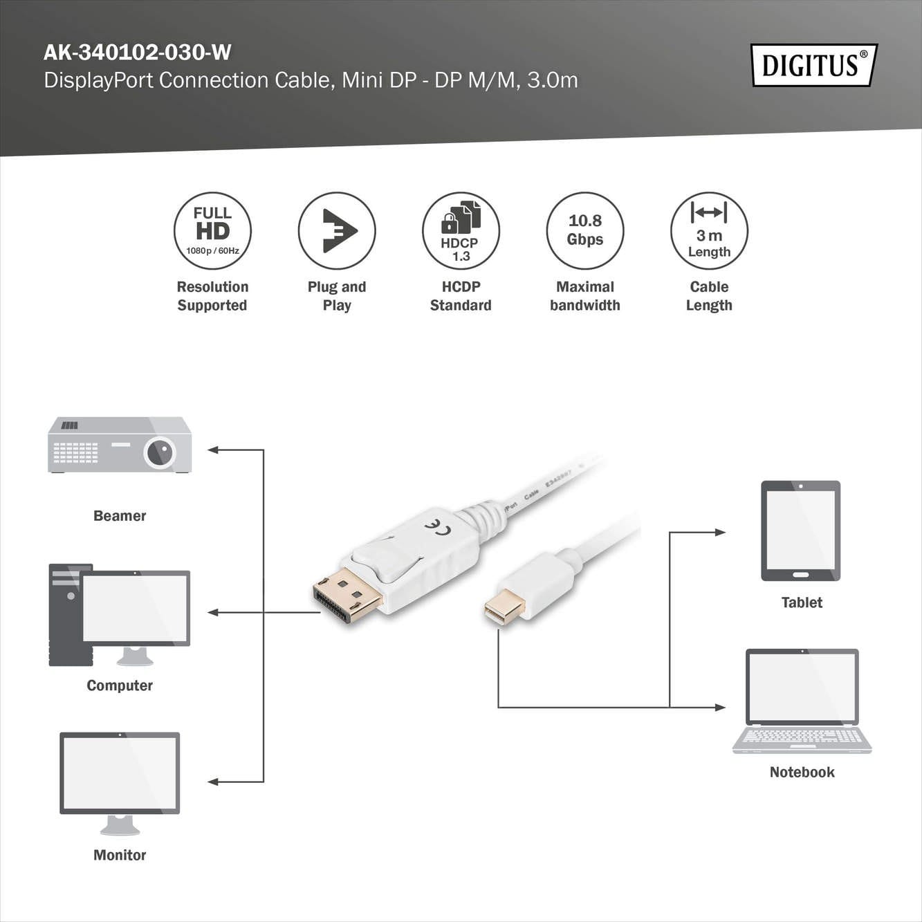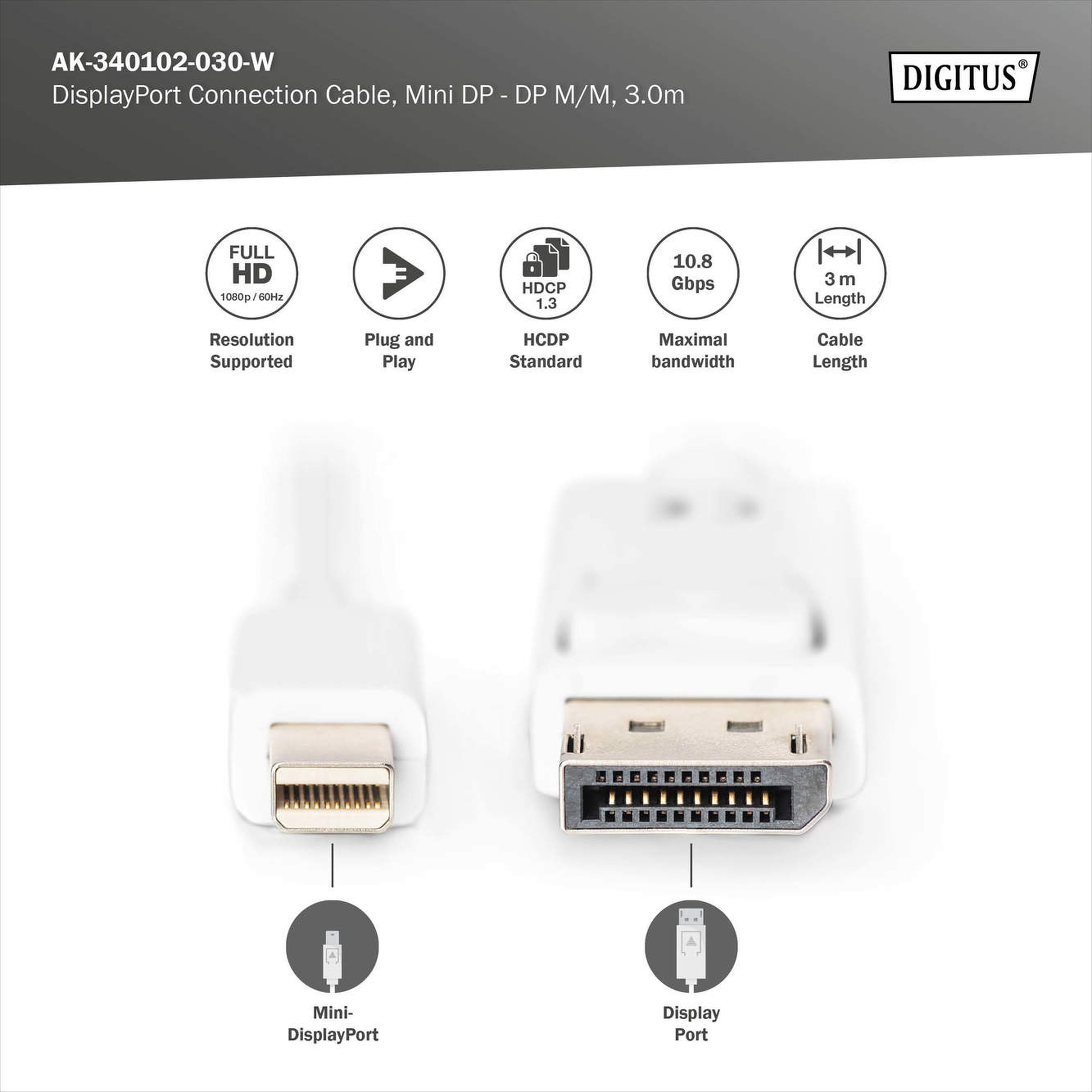 Assmann Electronic - Câble DisplayPort mini DP MM 3m verrouillage conforme DP 1.1a blanc - AK-340102-030-W
