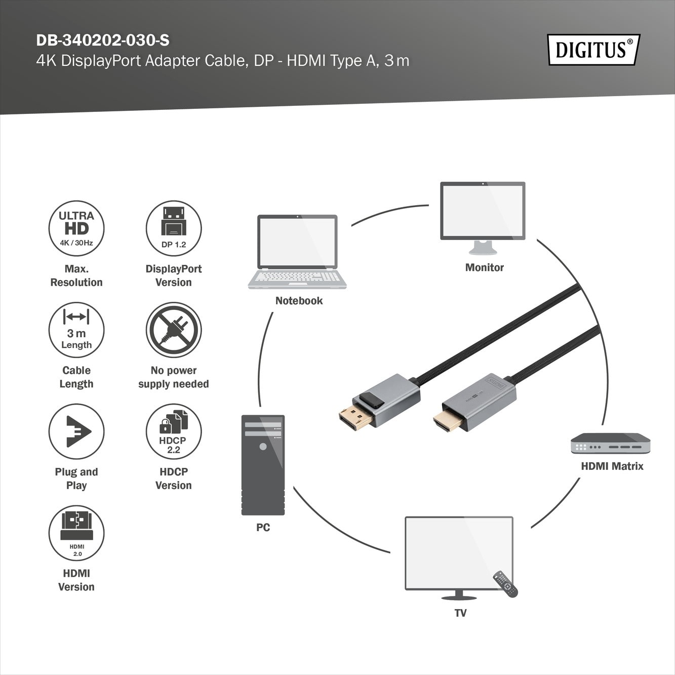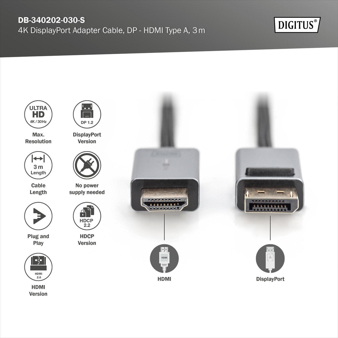Assmann Electronic - Câble DP vers HDMI A avec LED 4K / 30 Hz, 3m Gaine alu. plaqué or, 4K 30 Hz - DB-340202-030-S