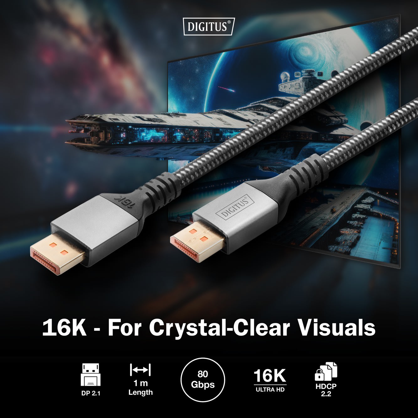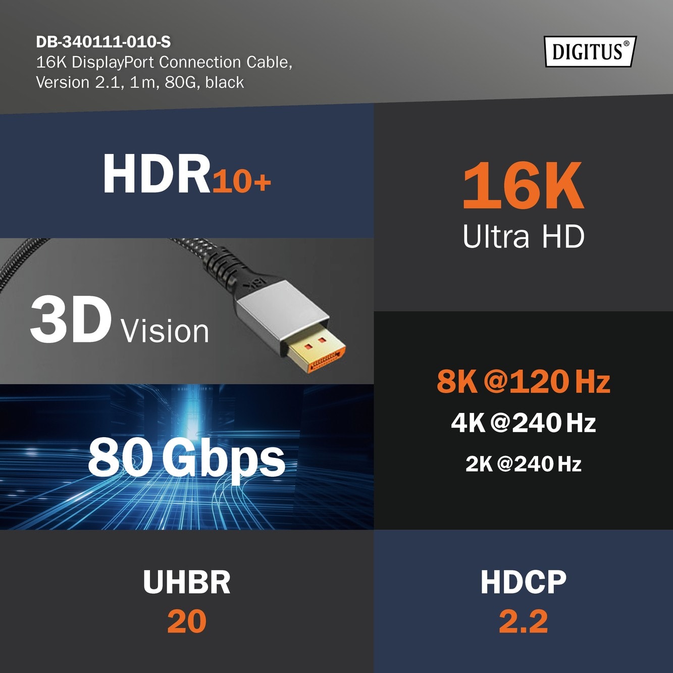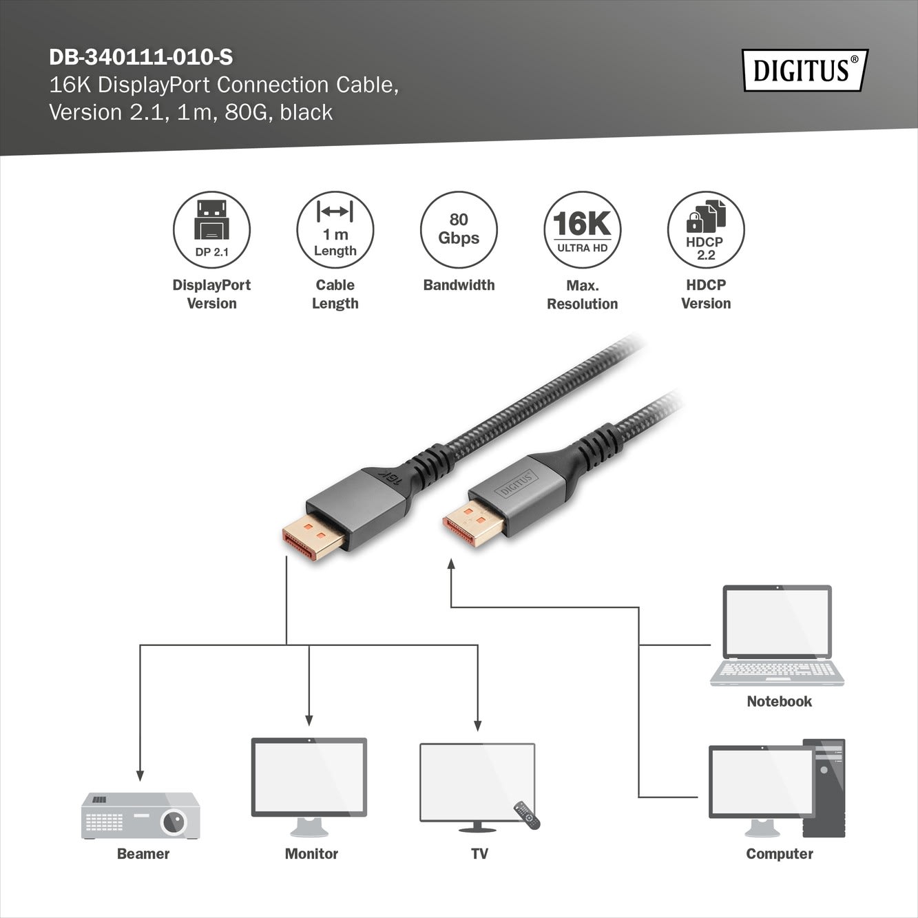 Assmann Electronic - Câble PREMIUM DisplayPort 2.1, M/M, 1m 16K, UHD, 80G, boîtier alum. noir - DB-340111-010-S