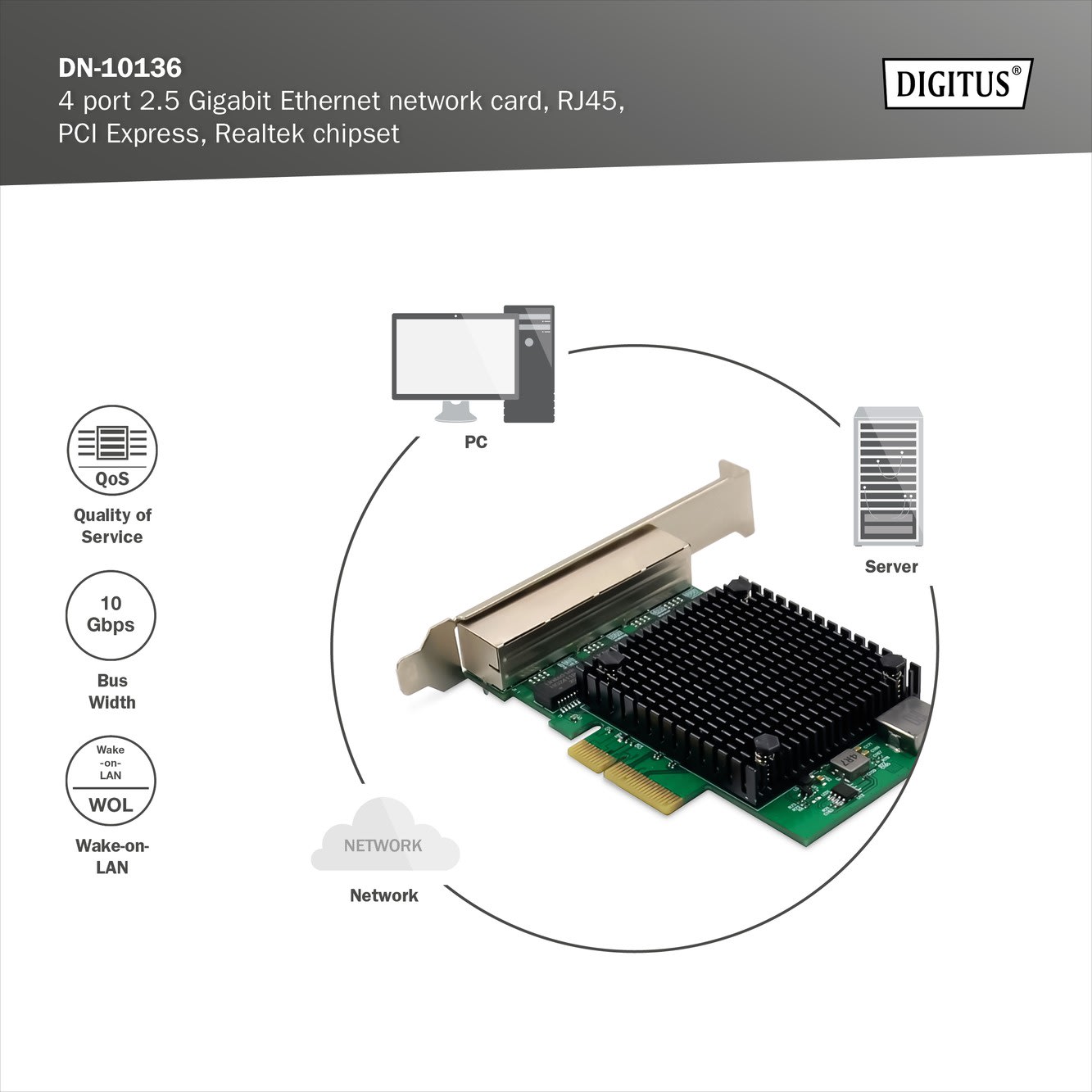 Assmann Electronic - Carte d'interface réseau serveur RTL8125B, 4 ports RJ45, 2,5 Gbit - DN-10136