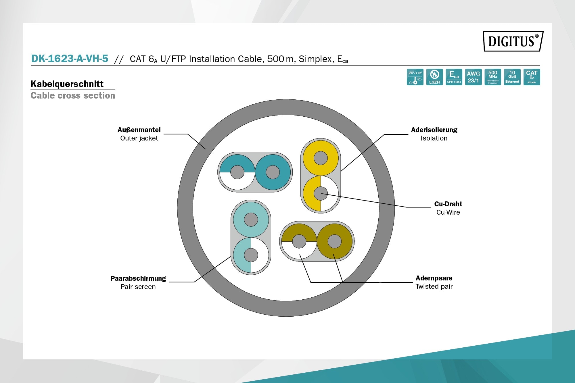 Les câbles d'installation U-FTP de catégorie 6A DIGITUS® ont été développés et testés selon les spécifications ISO/IEC 11801, DIN EN 50173, DIN EN 50288-10-1 catégorie 6A dans les bâtiments, bureaux, immeubles, centres de données…