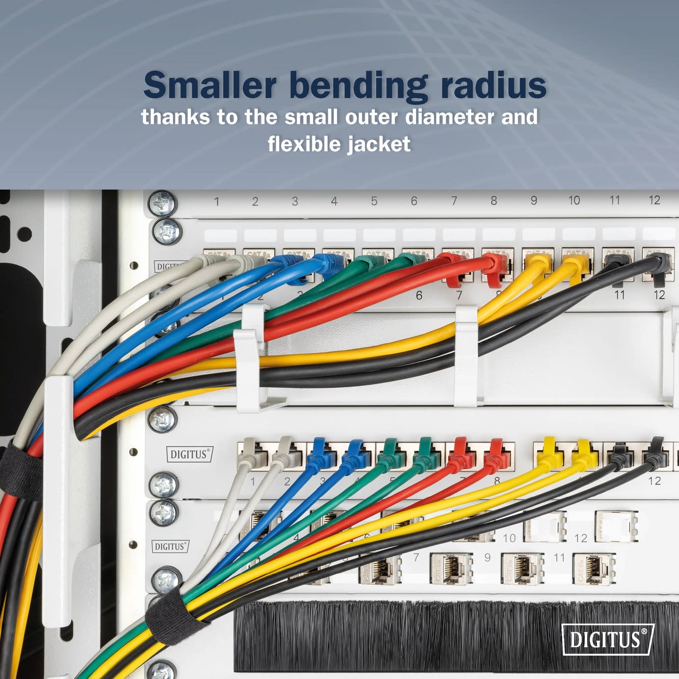 Le câble fin se distingue par son faible diamètre extérieur et sa gaine flexible. Il est fabriqué selon les normes ISO/IEC 11801 et DIN EN 50173 CAT 6A jusqu'à 500 MHz et est équipé d'un manchon anti-pliage moulé avec décharge de traction.