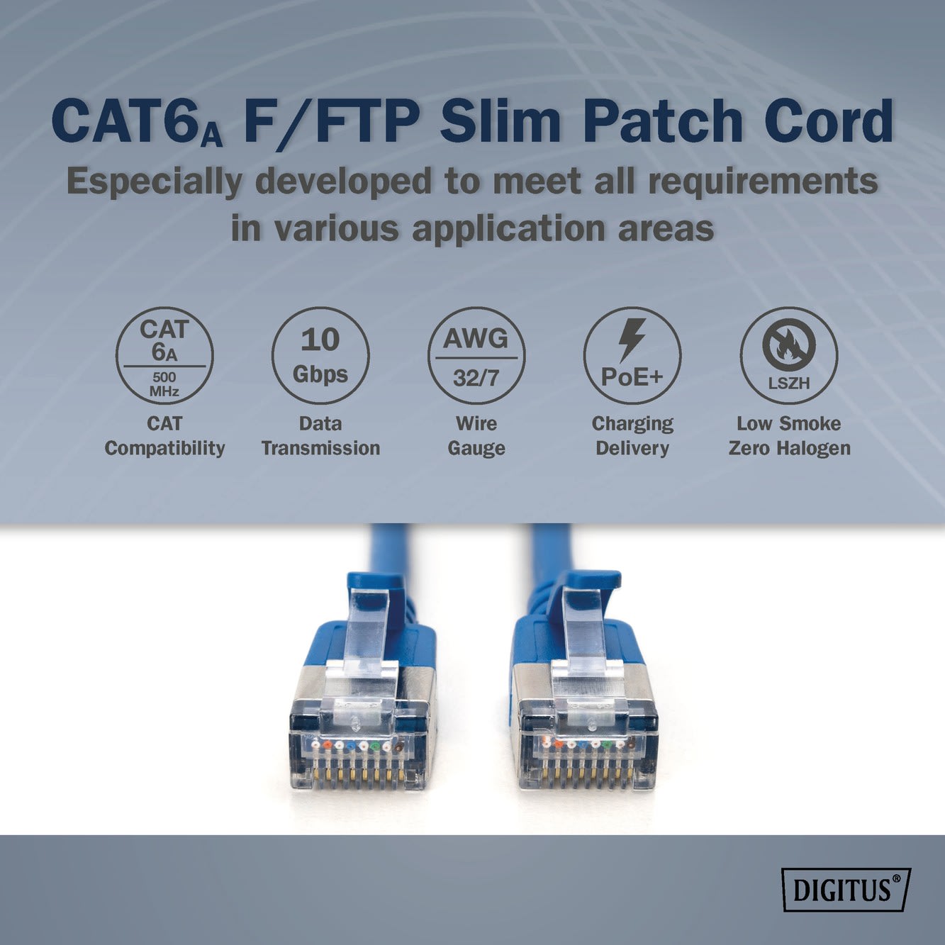 Le câble fin se distingue par son faible diamètre extérieur et sa gaine flexible. Il est fabriqué selon les normes ISO/IEC 11801 et DIN EN 50173 CAT 6A jusqu'à 500 MHz et est équipé d'un manchon anti-pliage moulé avec décharge de traction.
