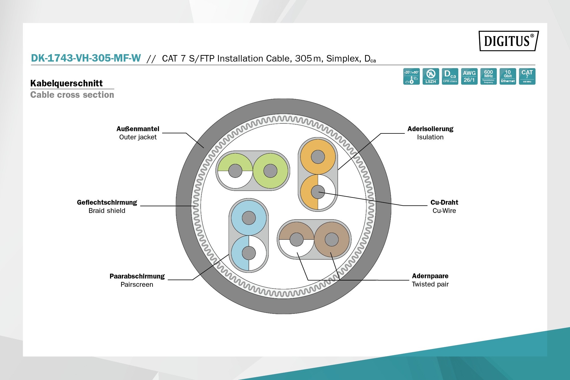 Assmann Electronic - CAT7 S-FTP, carton 305m, AWG 26/1, 600 MHz, Dca, LSZH-3, blanc RAL9003 - DK-1743-VH-305-MF-W