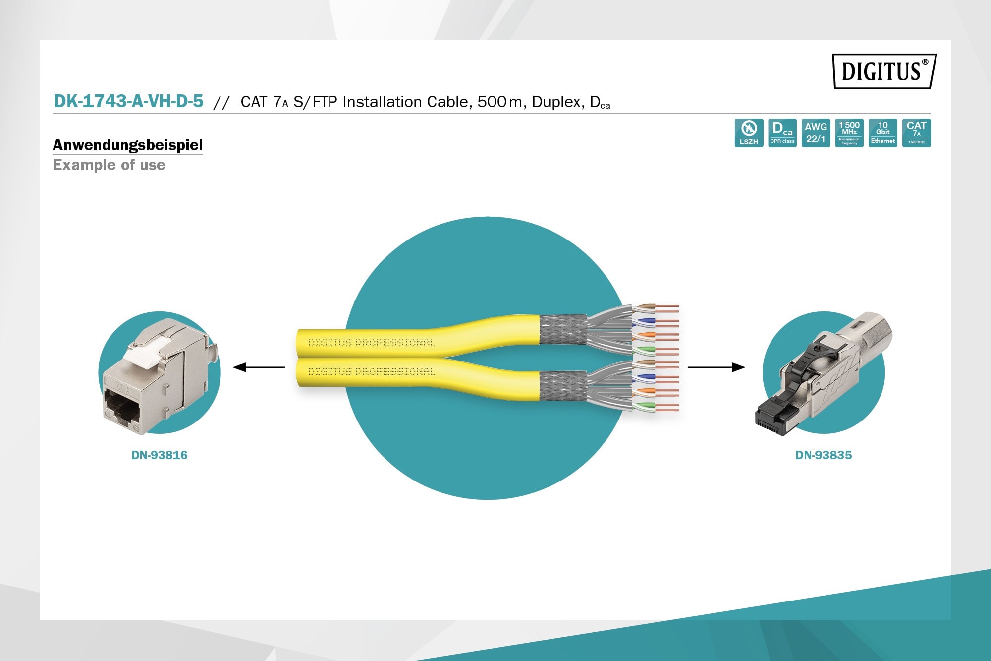 Assmann Electronic - CAT7A S-FTP, 1500 MHz Dca (EN 50575), AWG 22/1, bobine 500m, Dx, jaune - DK-1743-A-VH-D-5