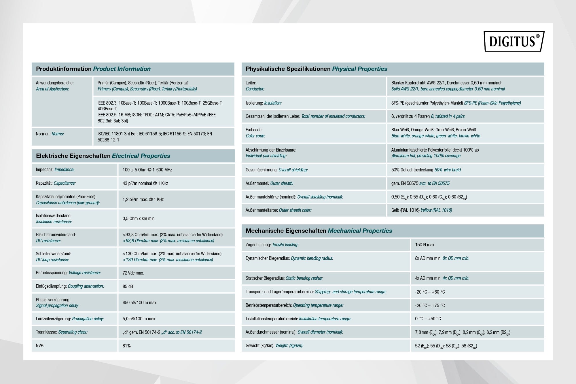 Les câbles d'installation S-FTP de catégorie 8.2 DIGITUS® ont été développés et testés selon les spécifications ISO/IEC 11801, DIN EN 50288-12-1, DIN EN 50173, IEC 60332-3-24 dans les bâtiments, bureaux, immeubles, centres de données.