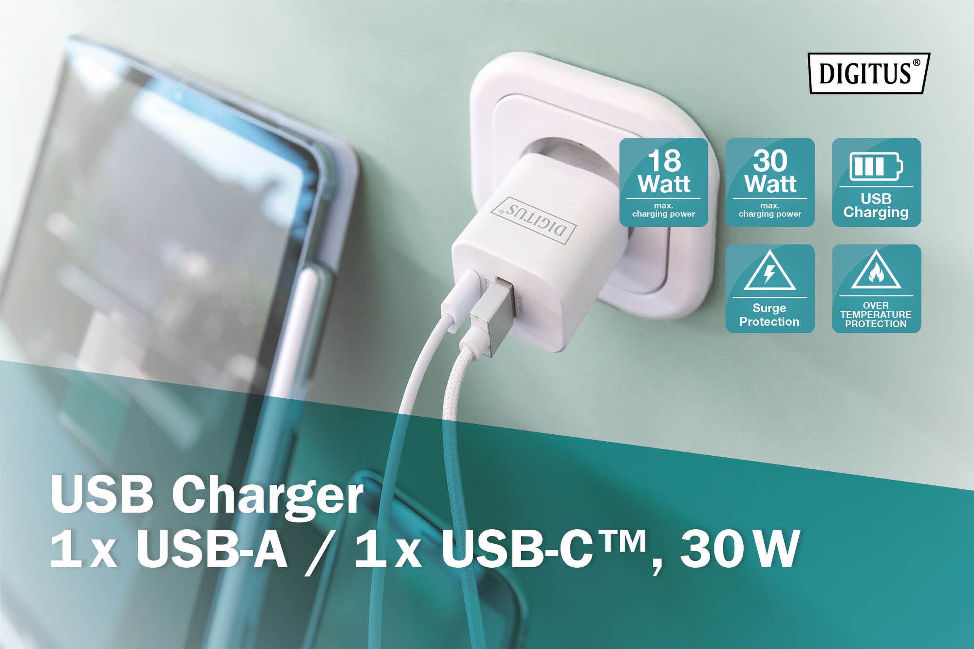 Assmann Electronic - Chargeur USB, 1 x USB A / 1 x USB-C Dual Port 30 W, 1 x 2,4 A, 1 x 3 A, QC 3.0 - DA-10062