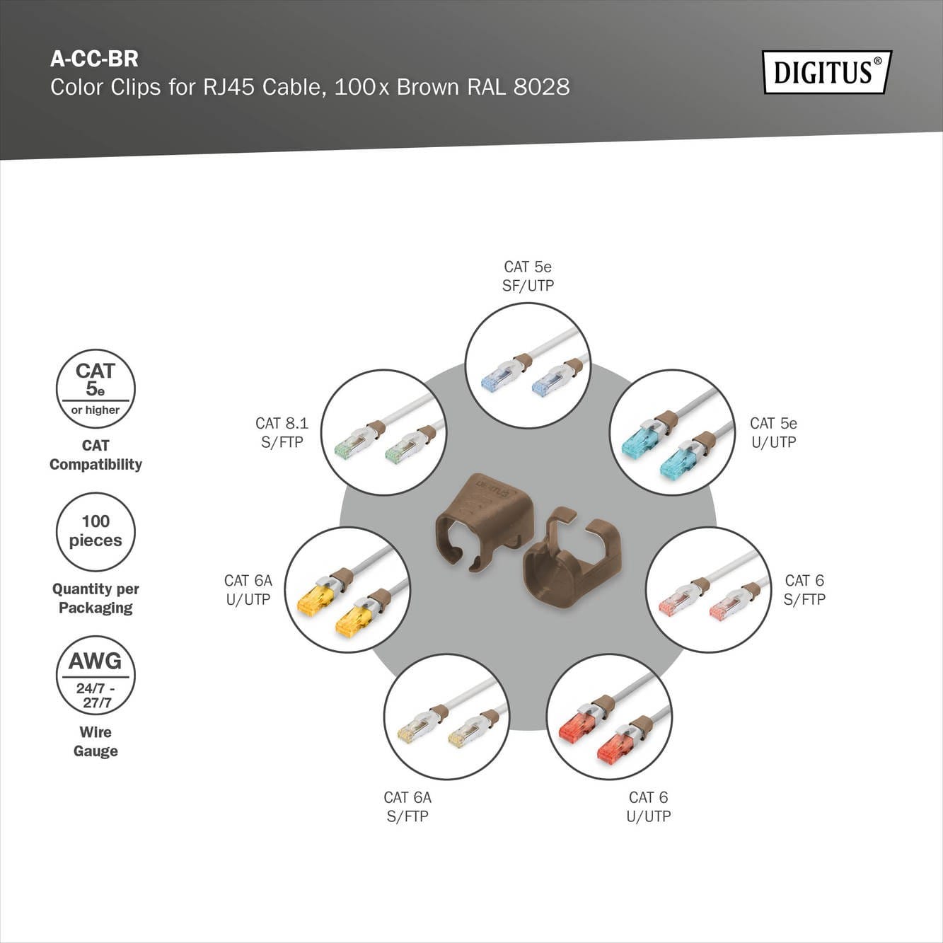 Assmann Electronic - Clips de couleur pour câbles RJ45 couleur marron, paquet de 100 pièces - A-CC-BR