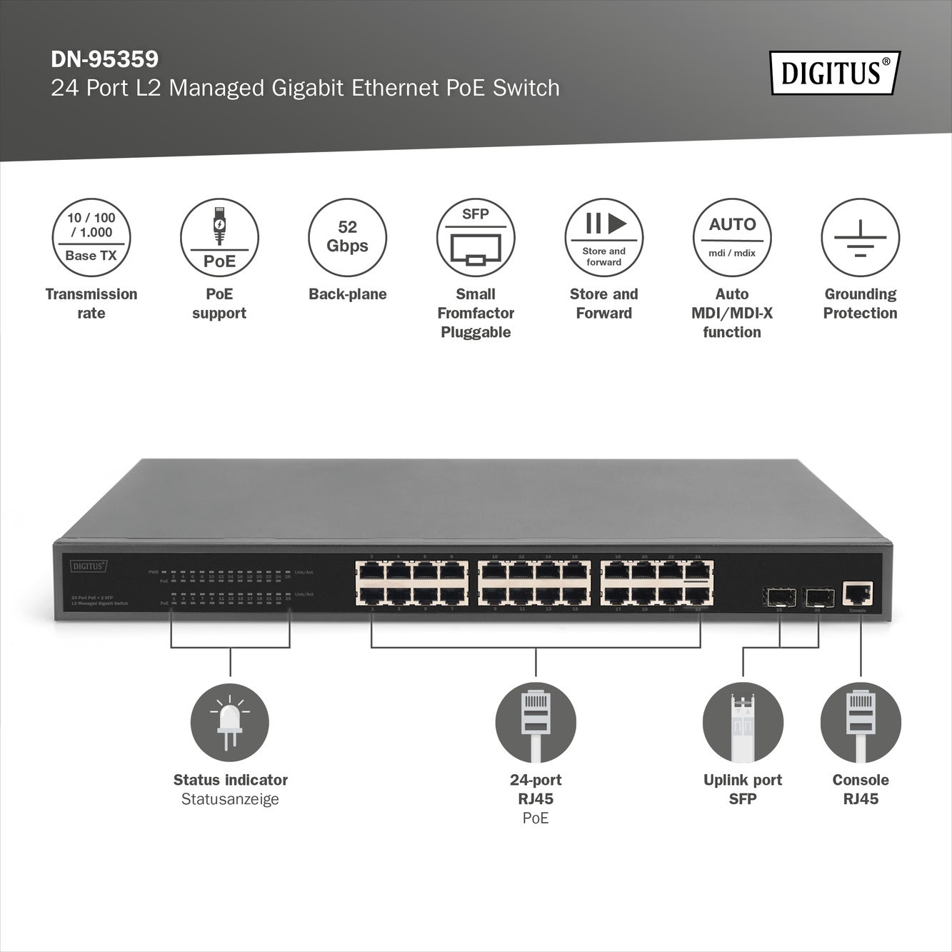 Assmann Electronic - Commutateur Gigabit Ethernet L2 géré 24 ports avec injecteur PoE, 2 ports SFP - DN-95359