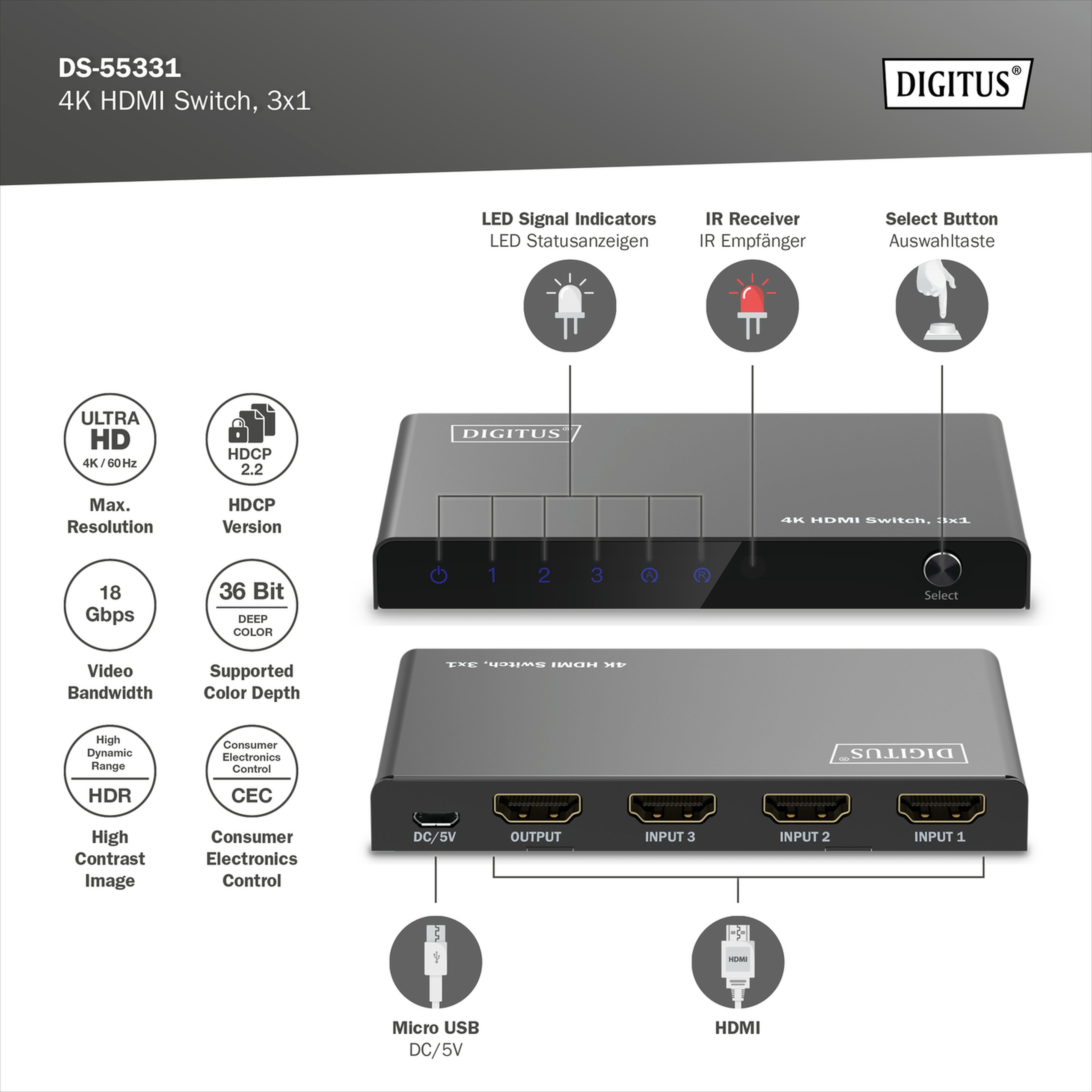 Assmann Electronic - Commutateur HDMI 3x1, 4K / 60 Hz HDCP 2.3 - DS-55331