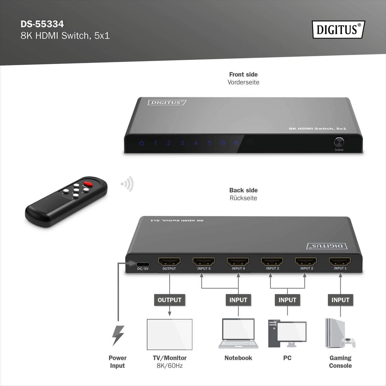 Assmann Electronic - Commutateur HDMI 5x1, 8K / 60 Hz (4:4:4), HDR, HDCP 2.3 - DS-55334