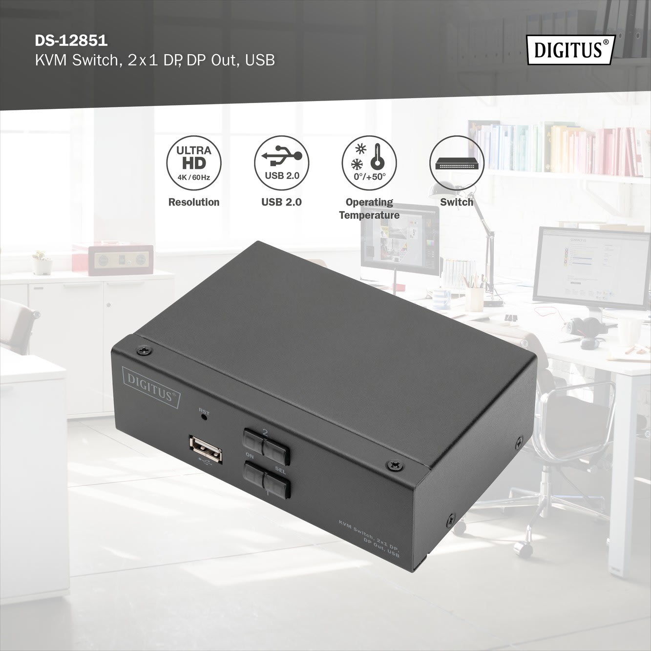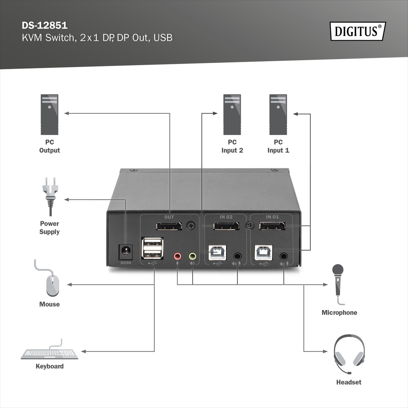 Assmann Electronic - Commutateur KVM 2x1 (DP, DP Out, USB) 2xUSB + 2 haut-parleurs + 2 micros - DS-12851