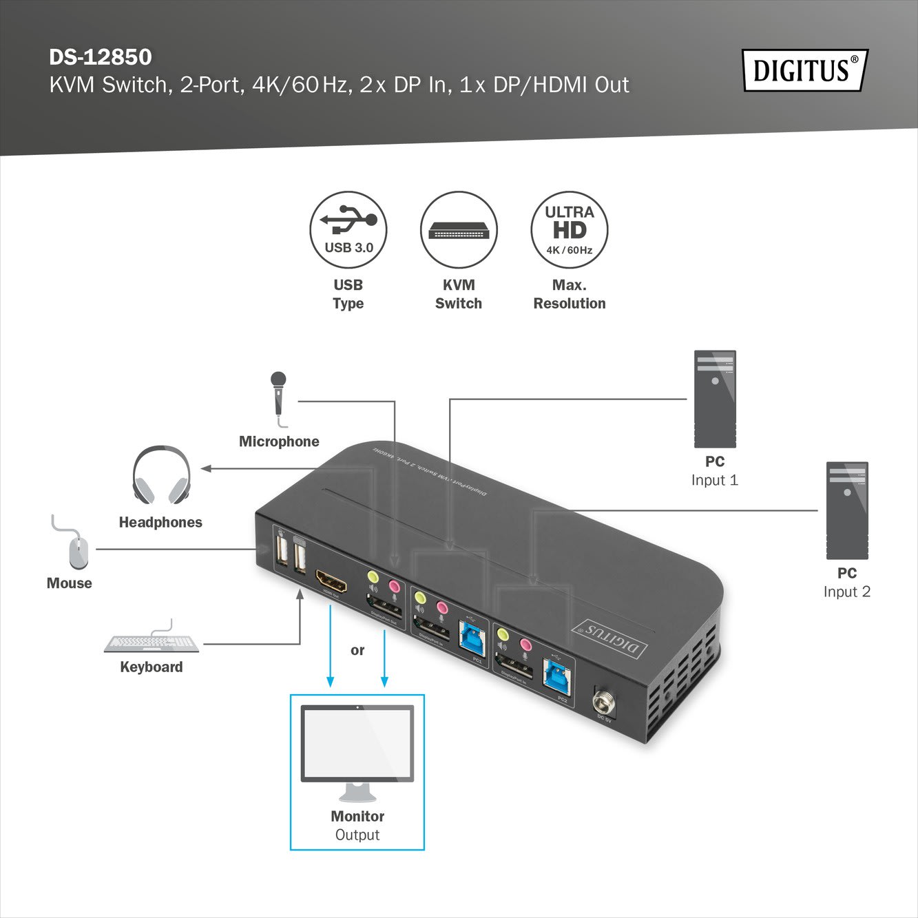 Assmann Electronic - Commutateur KVM, 2x1 ports DP, sortie DP/HDMI, USB 4Kx2K@60 Hz - DS-12850