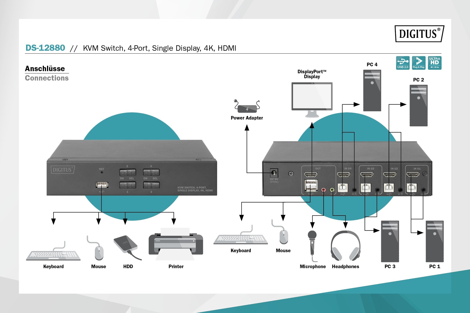 Assmann Electronic - Commutateur KVM 4 ports Simple affichage KVM HDMI de bureau - DS-12880