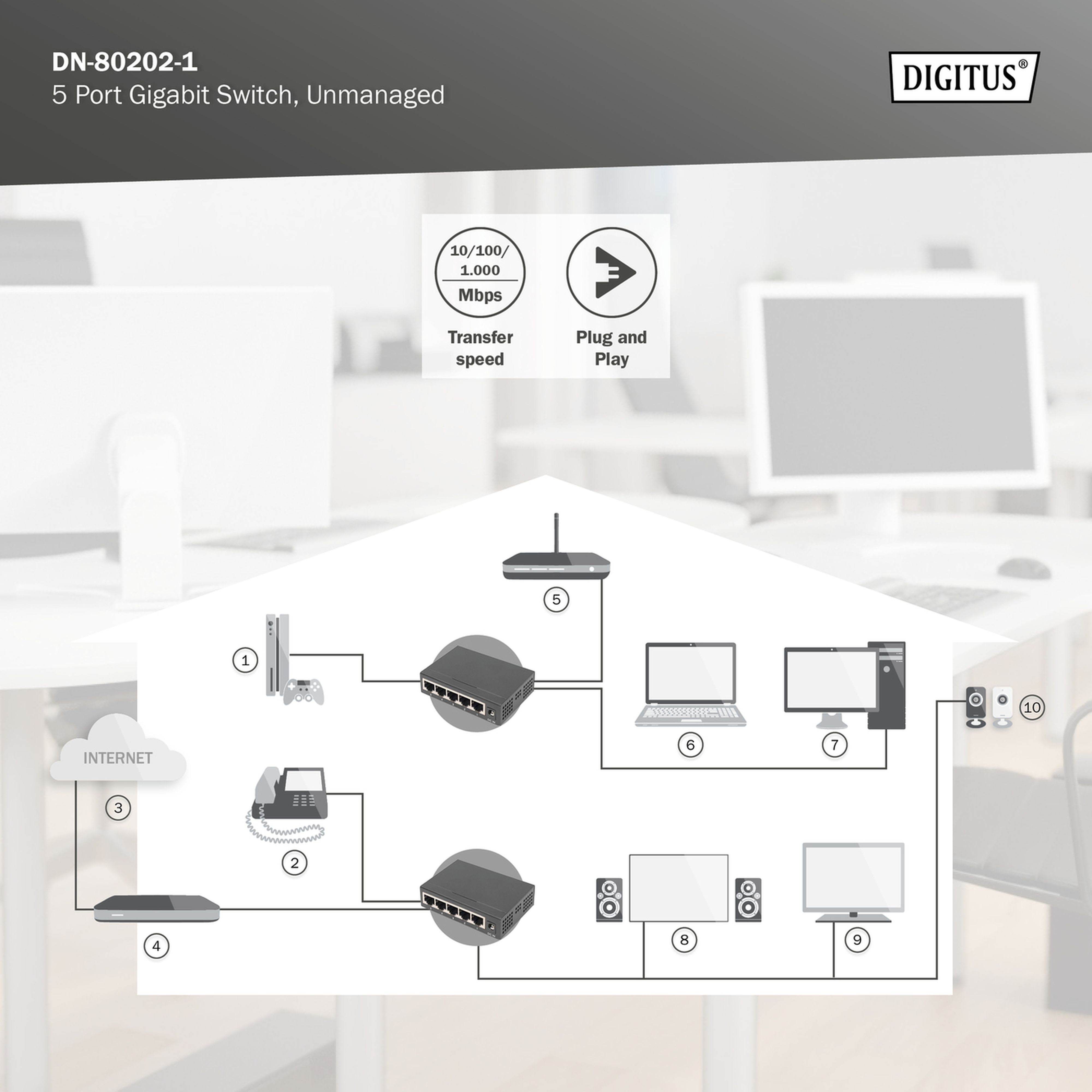 Assmann Electronic - Commutateur réseau 5 ports Gigabit Bureau non administrable, 10/100/1000 Mbit/s - DN-80202-1