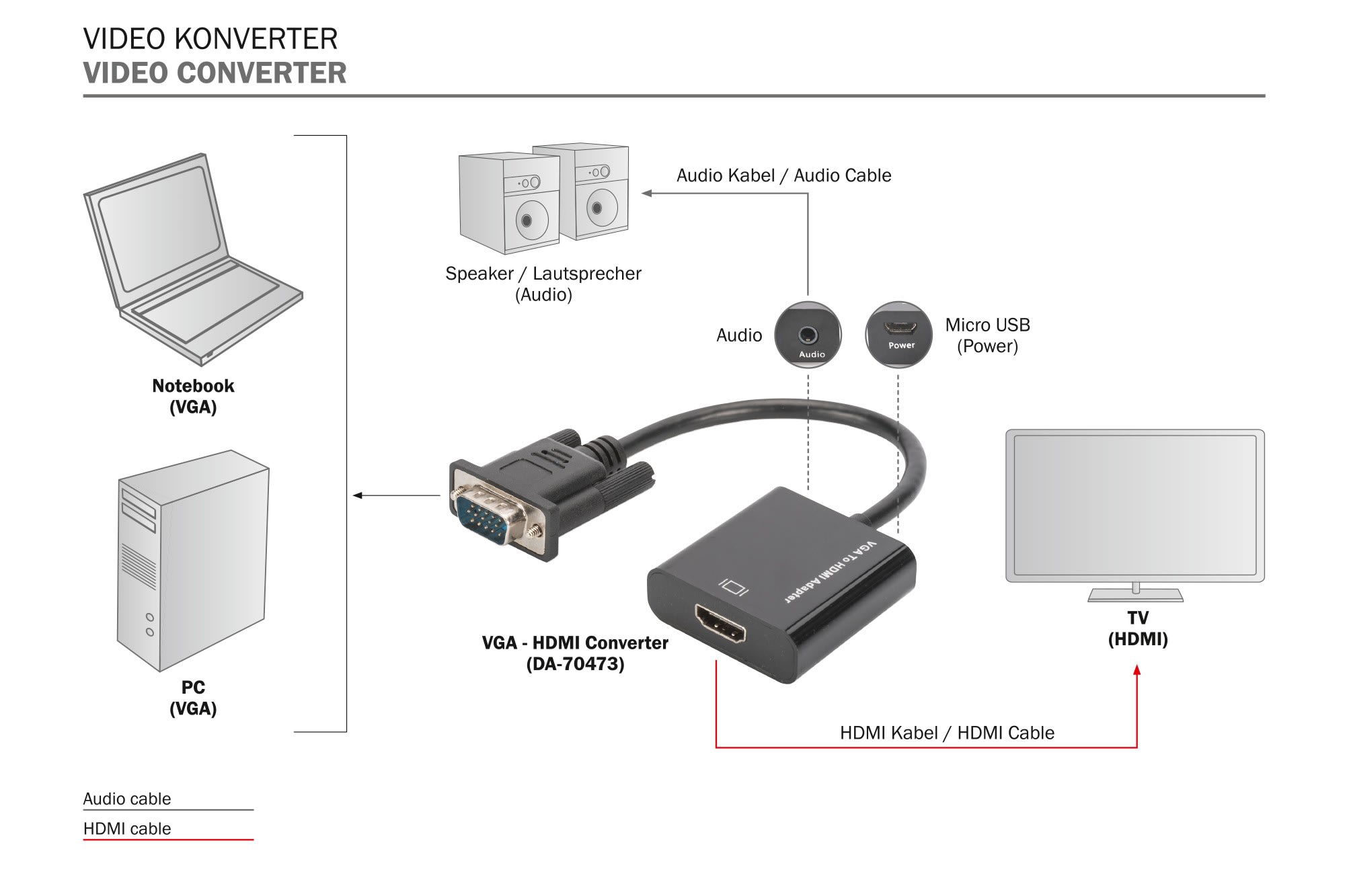 Assmann Electronic - Convertisseur VGA vers HDMI + audio (3,5mm) Full HD (1080p), câble 15 cm noir - DA-70473
