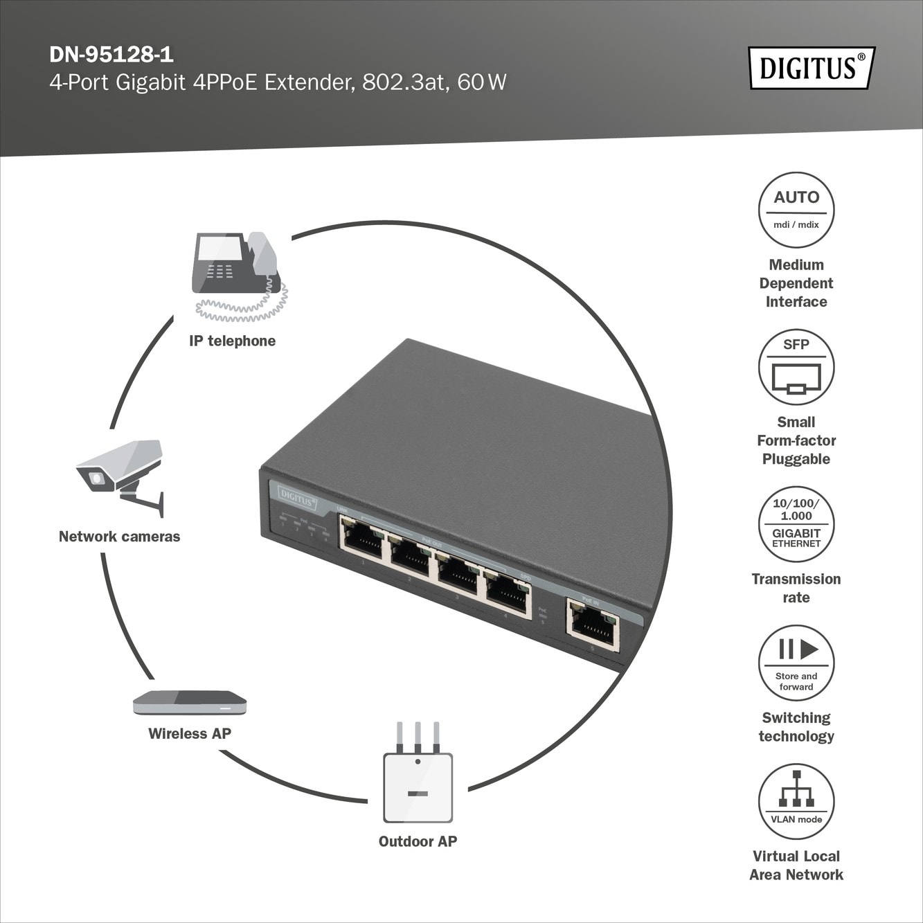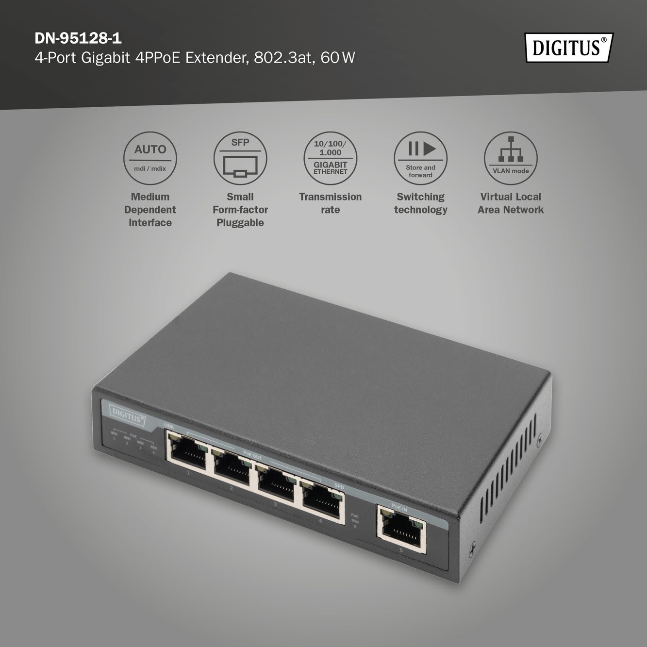 Assmann Electronic - Extender Gigabit PoE Indoor, 4 ports, 85W 100m, en cascade, auto-alimenté - DN-95128-1