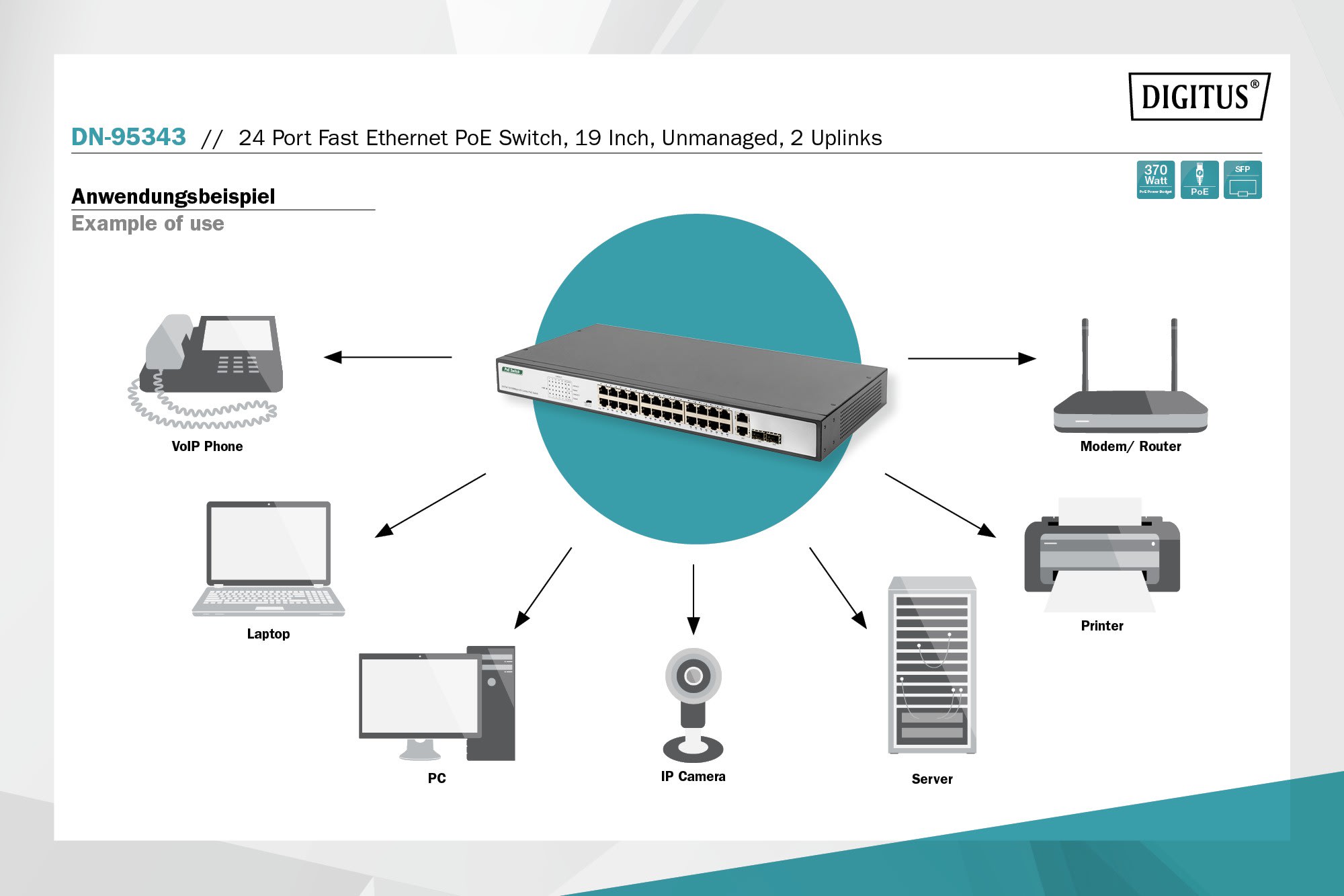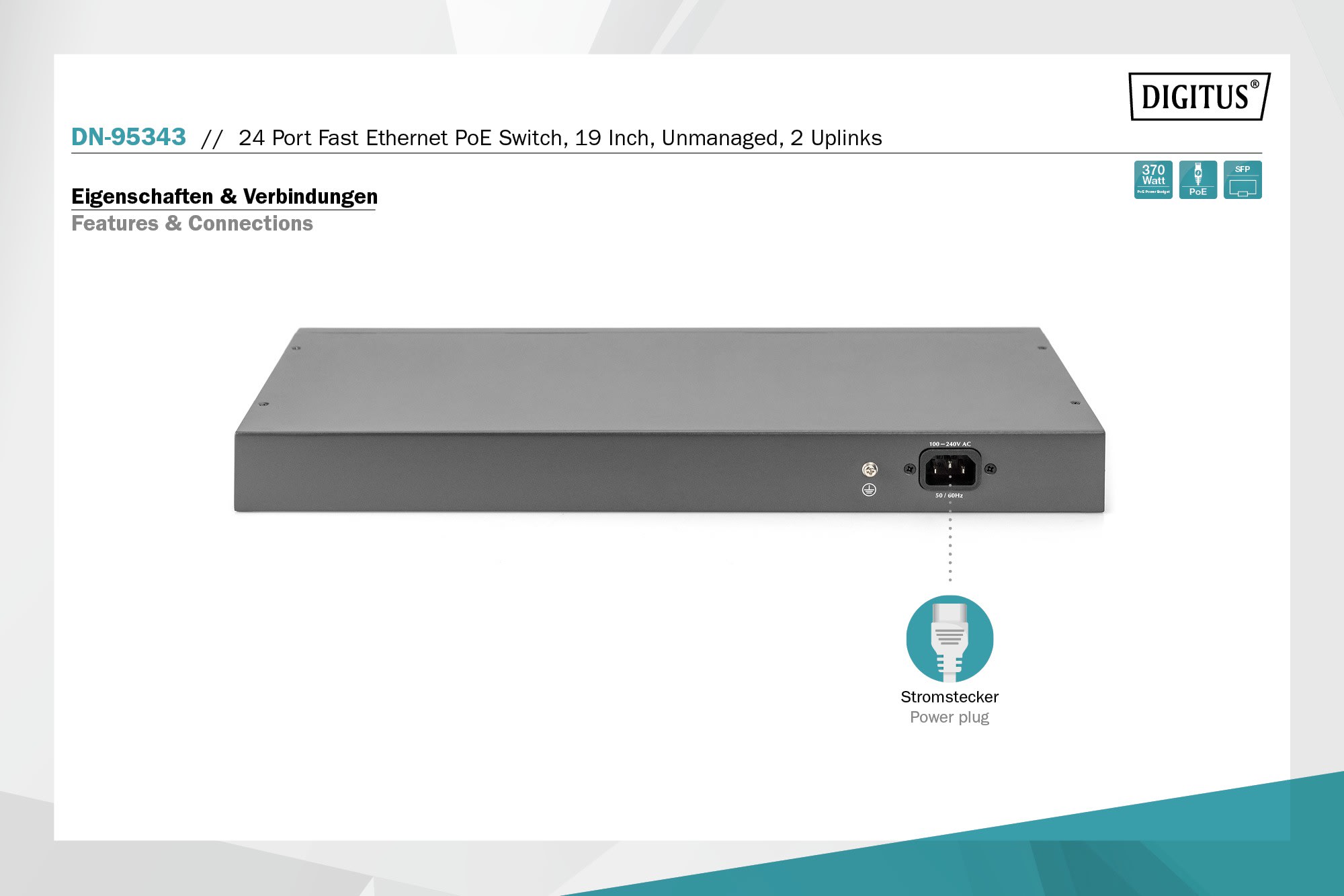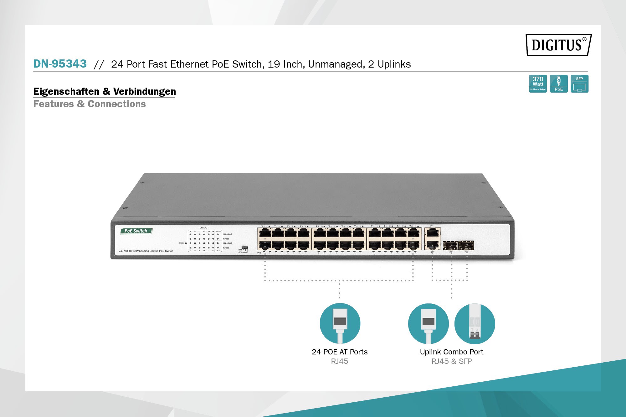 Assmann Electronic - Fast Ethernet PoE Switch 24-port PoE + 2 Combo, 390W PoE budget - DN-95343