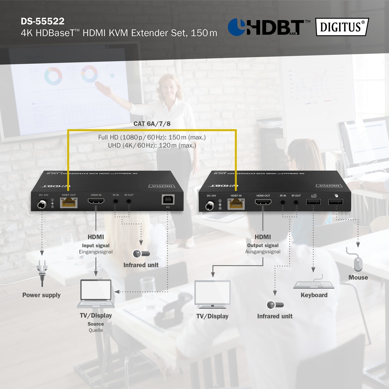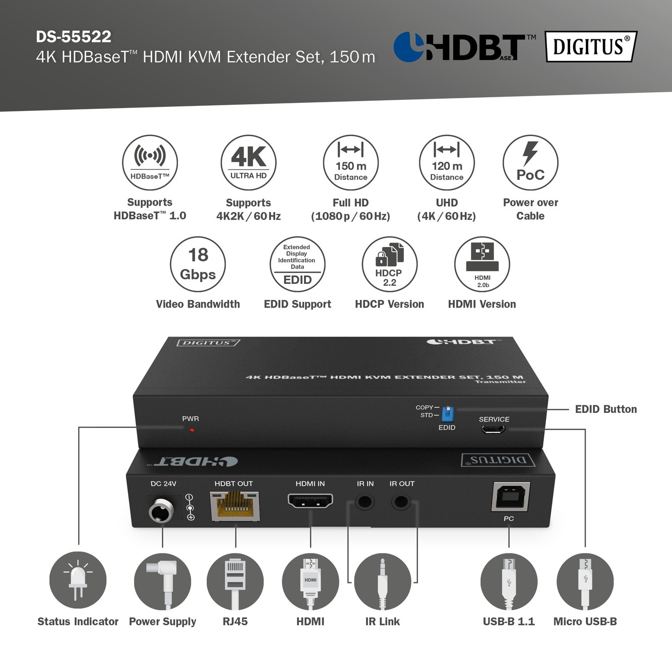 Assmann Electronic - Kit d'extension KVM HDBaseT, 150 m 4K / 60 Hz, USB 1.1, PoC, IR, noir - DS-55522